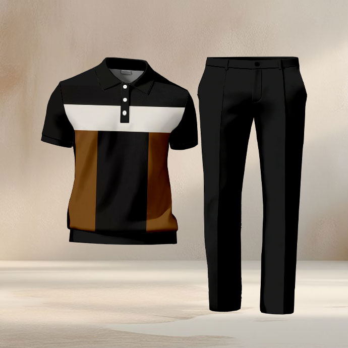 Men's Casual Black & Brown Color Matching Printed Short Sleeved Polo Shirt & Trousers Two-Piece Set