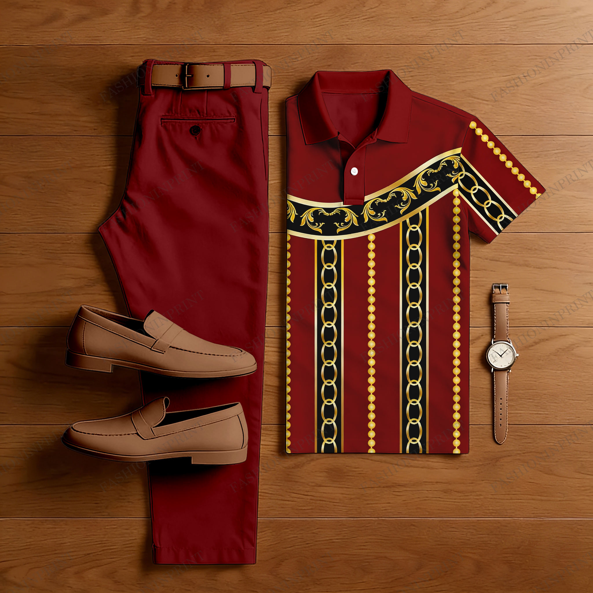 Men's Casual Burgundy & Black Color Matching Printed Short Sleeved Polo Shirt & Trousers Two-Piece Set