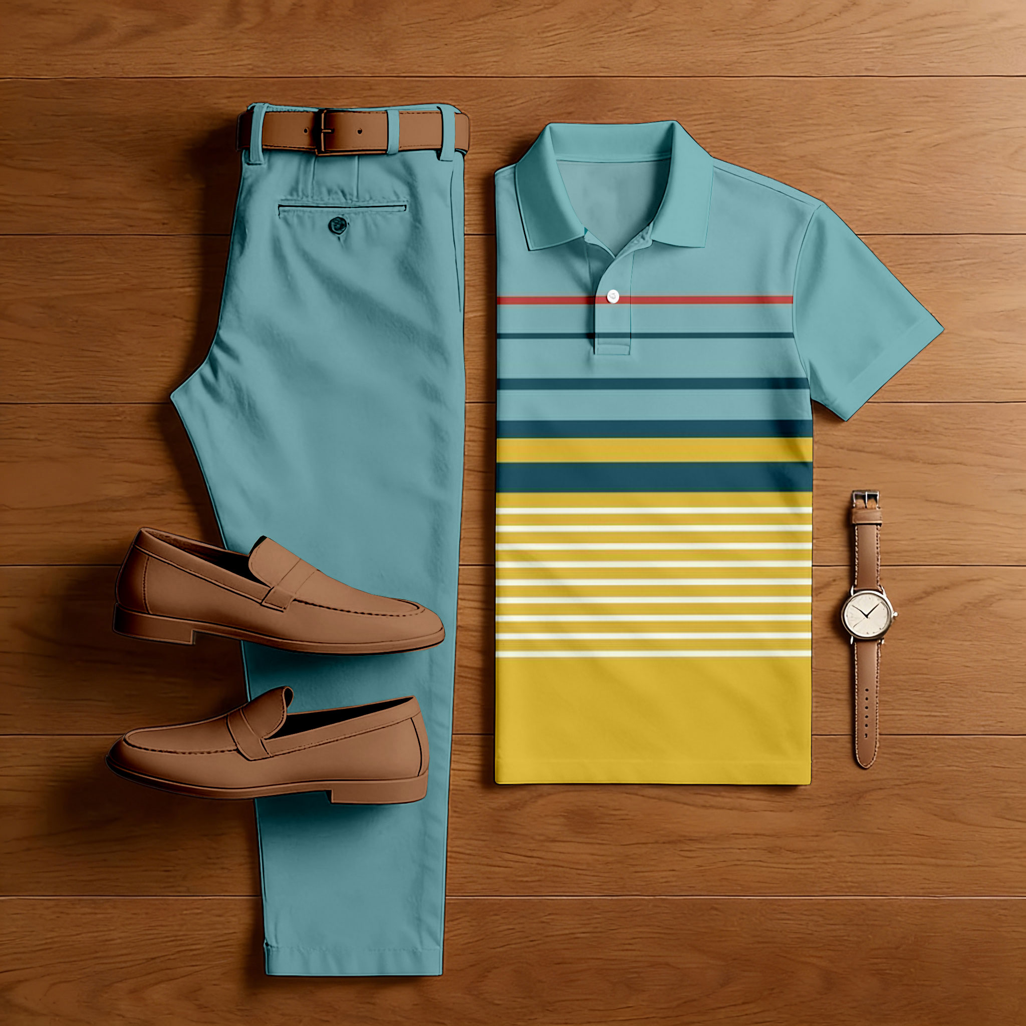 Men's Casual Green & Yellow Color Matching Striped Printed Short Sleeved Polo Shirt & Trousers Two-Piece Set