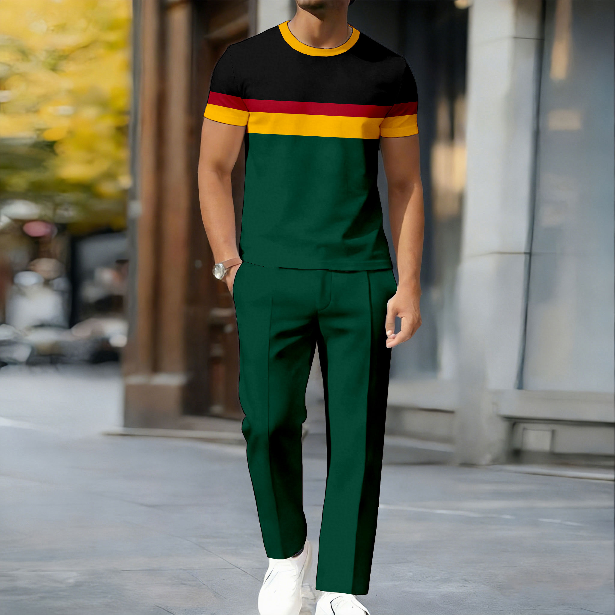 Men's Casual Black & Green Color Matching Printed Short Sleeved T-Shirt & Trousers Two-Piece Set
