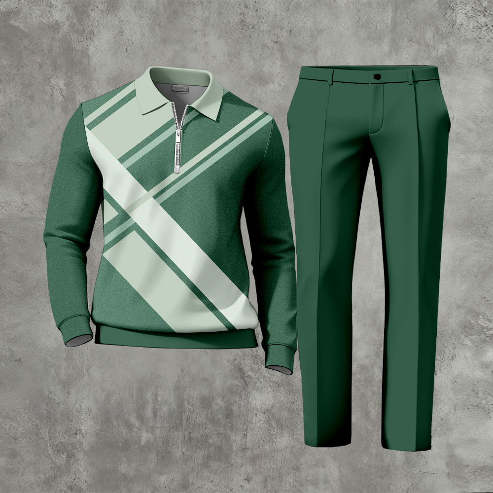 Men's Casual Green Color Matching Geometric Printed Zipper Long Sleeved Polo Shirt & Trousers Two-Piece Set