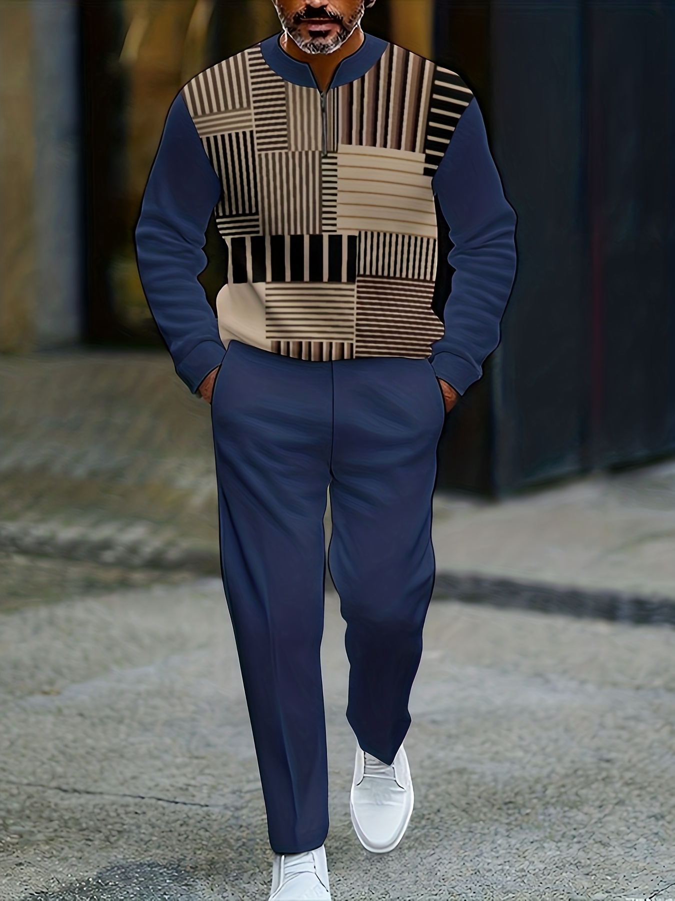 Men's Casual Color Matching Striped Printed Round-Neck Zipper Long Sleeved Navy Blue Trousers Two-Piece Set