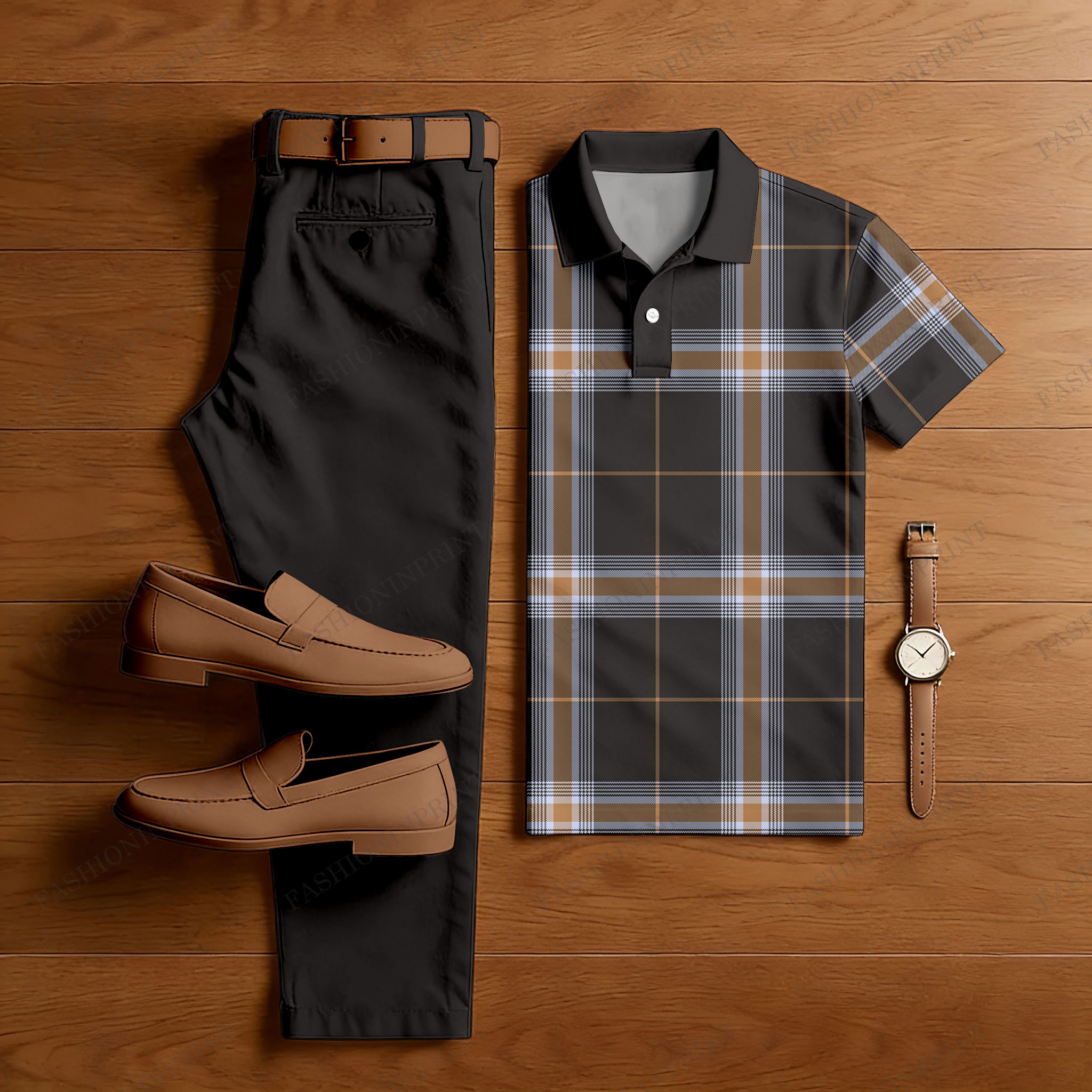 Men's Casual Dark Brown & Brown Color Matching Checkered Printed Short Sleeved Polo Shirt & Trousers Two-Piece Set