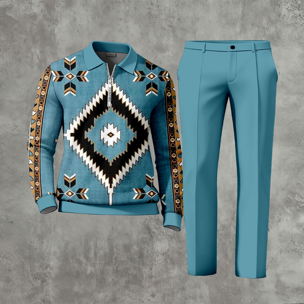 Men's Casual Ethnic Style Totem Elements Printed Polo-Collar Zipper Long Sleeved Trousers Blue Two-Piece Set