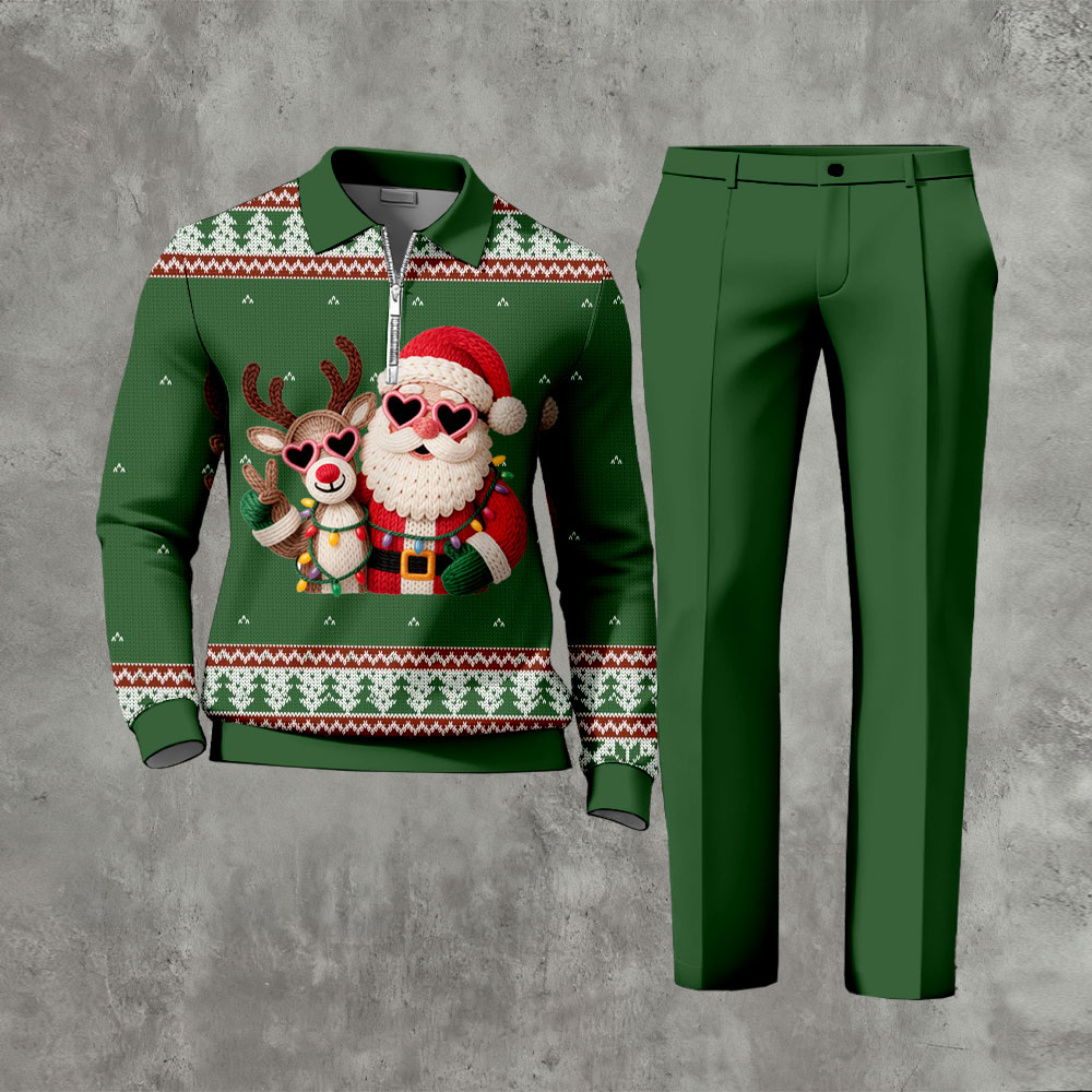 Men's Casual Green Christmas Printed Zipper Long Sleeved Polo Shirt & Trousers Two-Piece Set