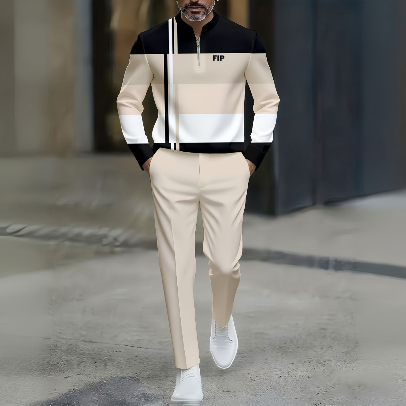 Men's Casual Khaki & Black Color Matching Geoemtric Printed Round-Neck Zipper Long Sleeved Trousers Two-Piece Set