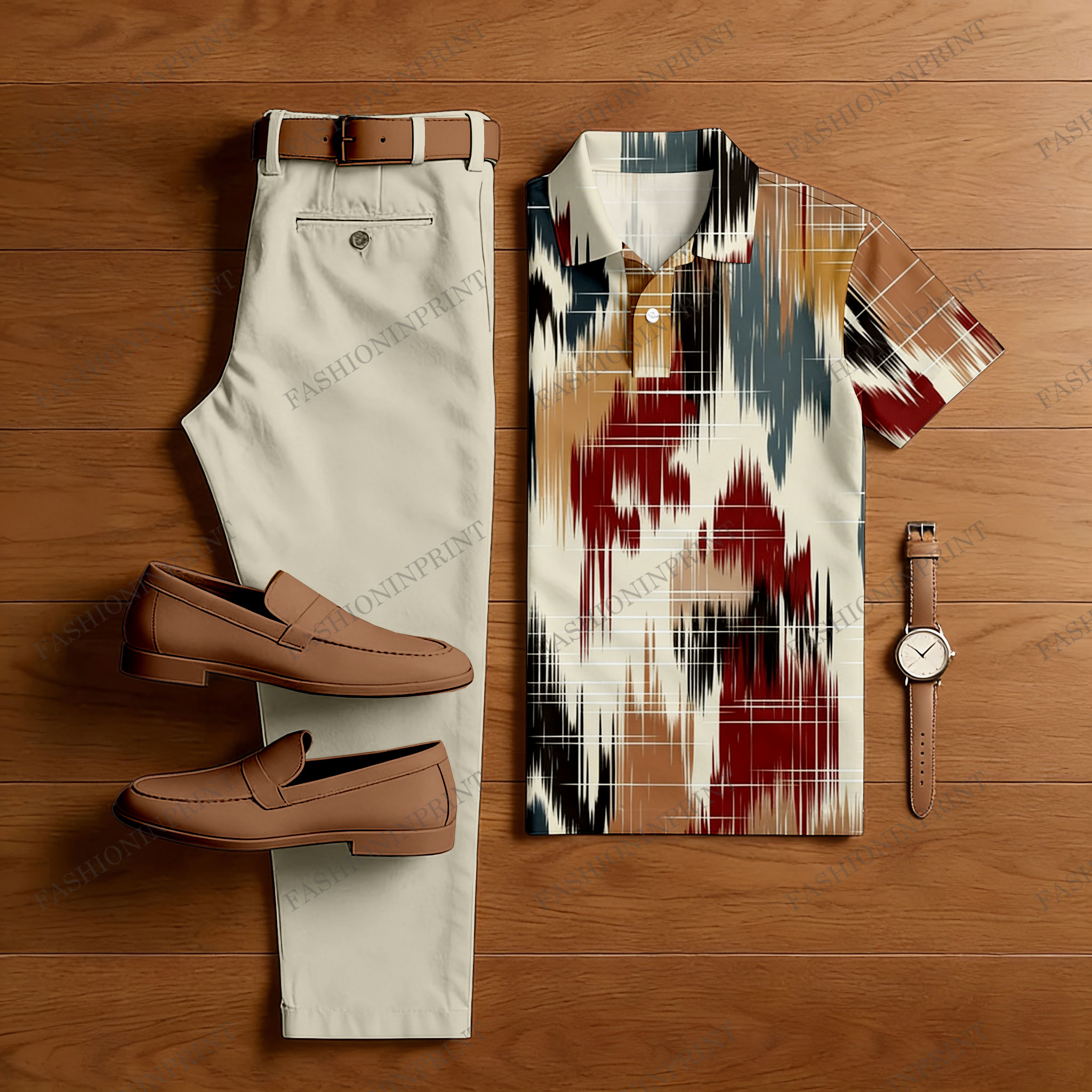 Men's Casual Khaki & Maroon Color Matching Retro Style Printed Short Sleeved Polo Shirt & Trousers Two-Piece Set