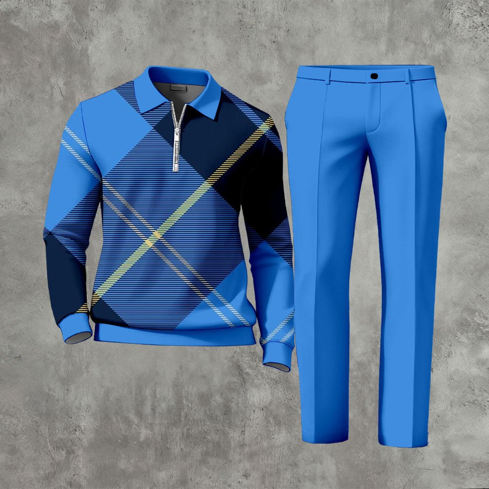 Men's Casual Royal Blue Color Matching Checked Printed Polo-Collar Zipper Long Sleeved Trousers Two-Piece Set
