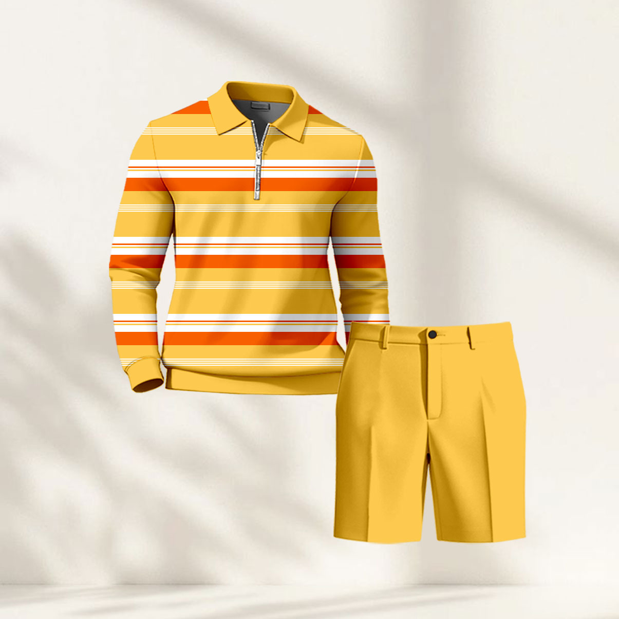 Men's Casual Yellow & Orange Color Matching Striped Printed Zipper Long Sleeved Polo Shirt & Five-Point Pants Two-Piece Set