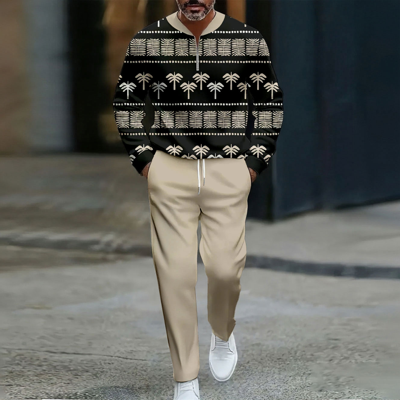 Men's Casual Color Matching Printed Polo-Collar Zipper Long Sleeved Trousers Two-Piece Set