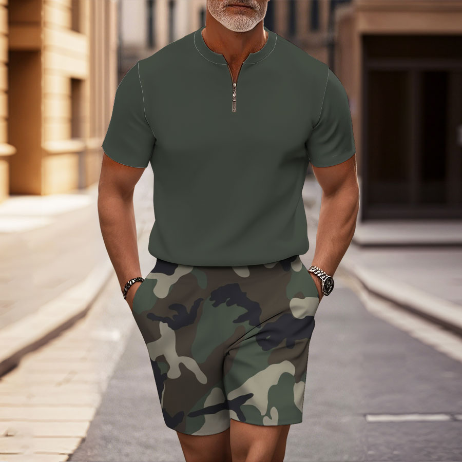 Men's Fashion Casual Round-Neck Zipper Geometric Printed Short-Sleeved Two-Piece Set