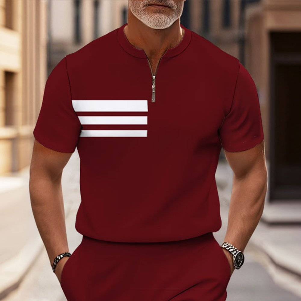 Men's Fashion Casual Maroon & White Color Matching Striped Printed Round-Neck Zipper Short-Sleeved Two-Piece Set