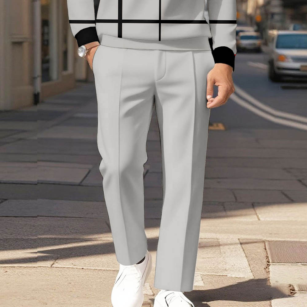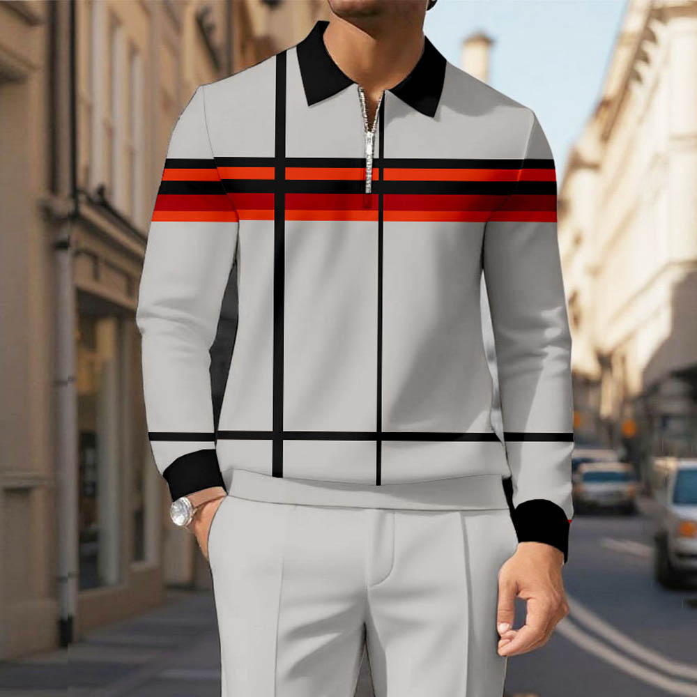 Men's Gray & Red Casual Color Matching Striped Printed Polo-Collar Zipper Long Sleeved Trousers Two-Piece Set