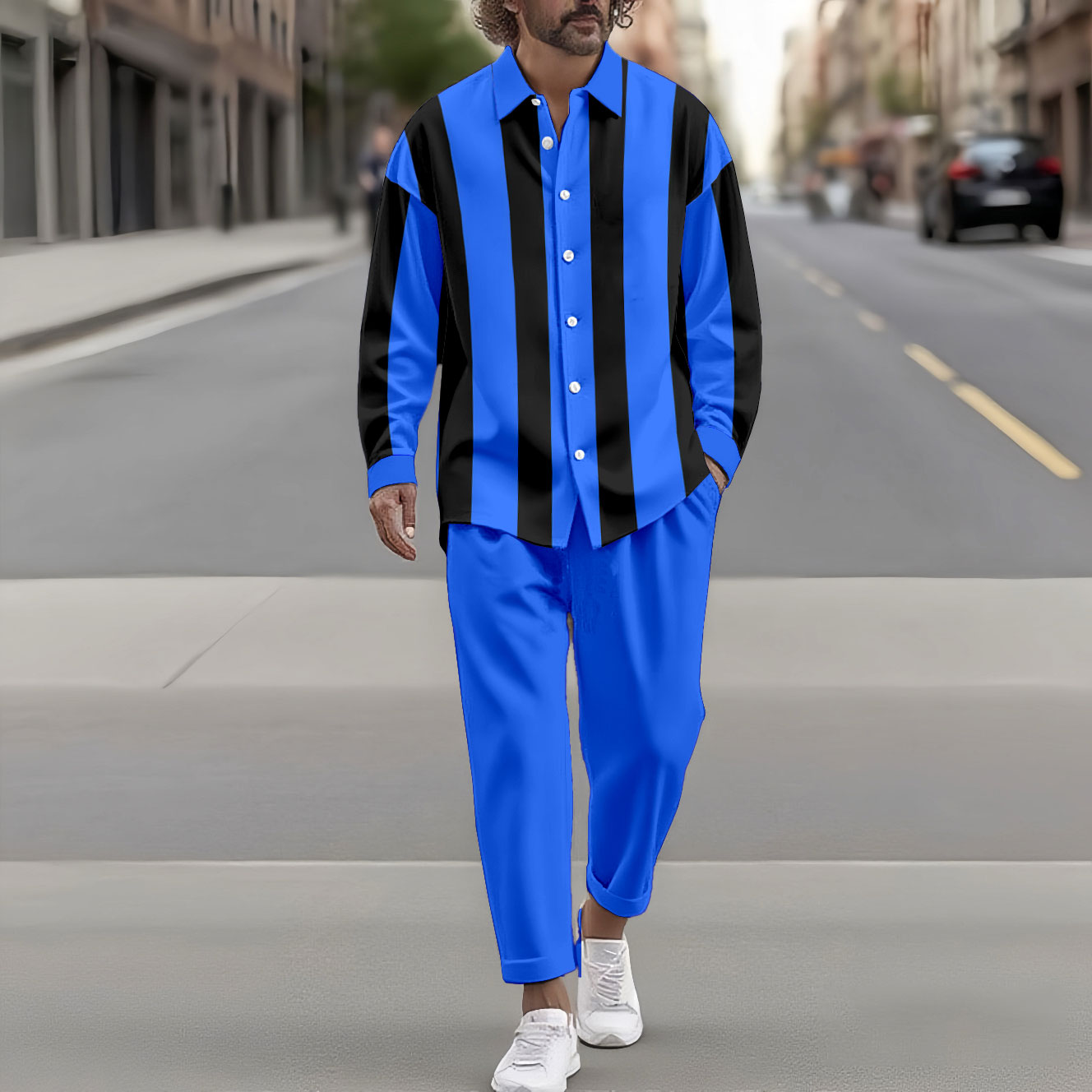 Men's Lapel Royal Blue Color Matching Striped Printed Long Sleeved Shirts & Casual Pants Two-Piece Set