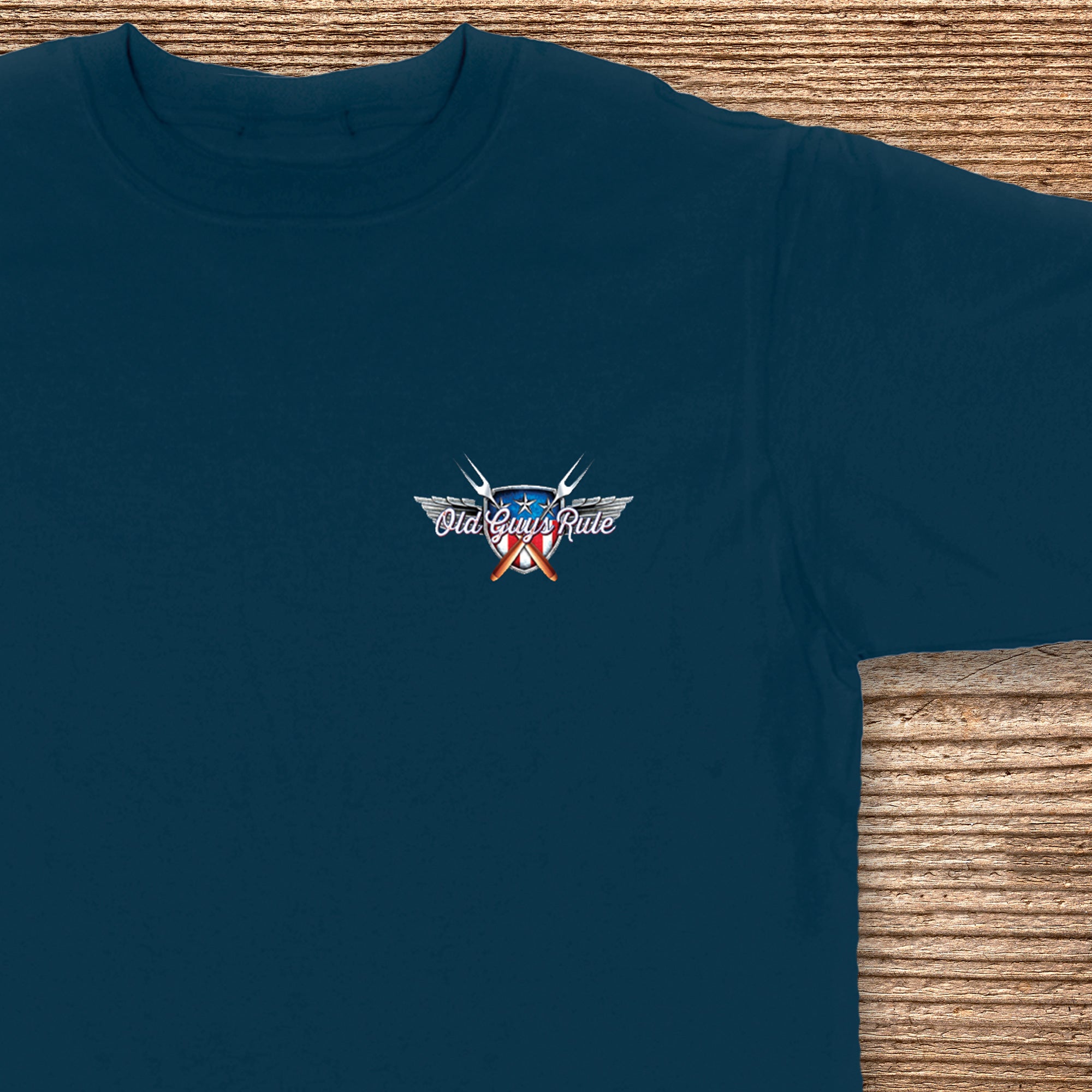 | Shirt Text: "Old Guys Rule -- Here's To The Red, White & Q" |