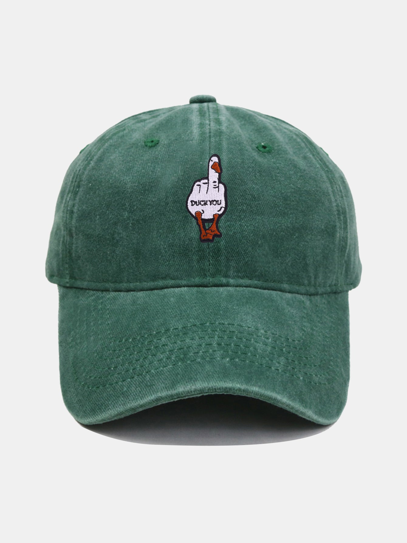 Make a bold (and cheeky) statement with this “Duck You” embroidered baseball cap. Featuring a cartoon duck cleverly flipping the bird, this cap adds a dose of humor and attitude to any casual outfit. Made from soft, breathable cotton with a relaxed fit, it's perfect for those who like their accessories with a little edge.