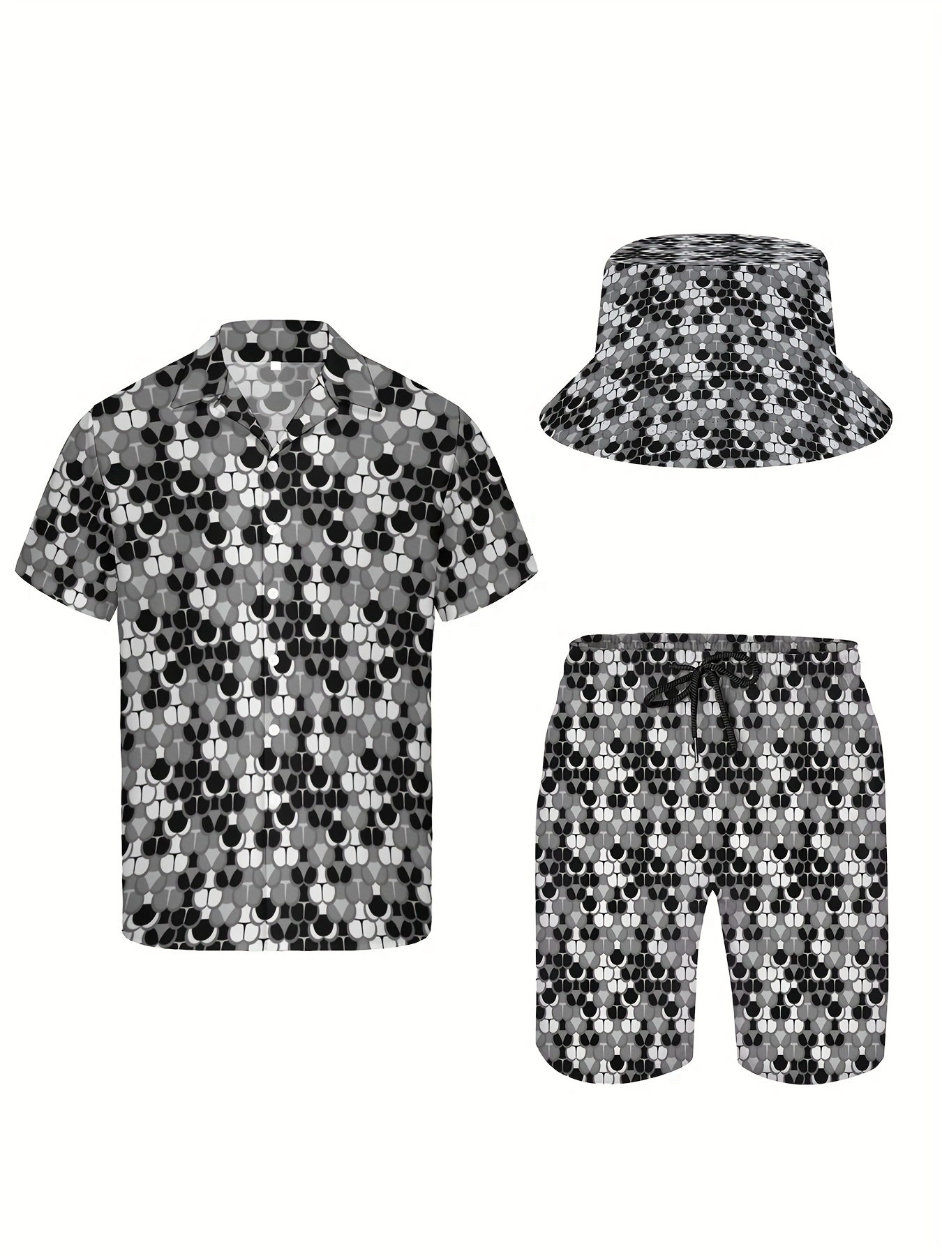 3pcs Men's Hawaiian Black & Gray Pattern Short Sleeves Shirt & Short & Fisherman's Hat