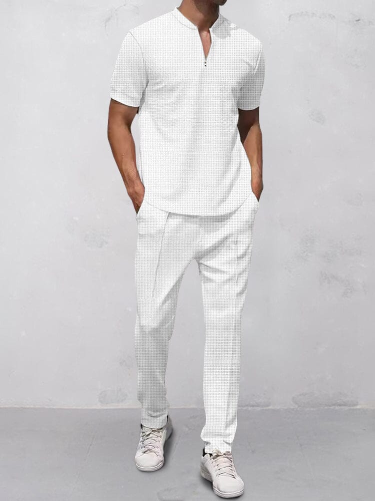 • Top Details: Short Sleeves, collarless, half zipper closure