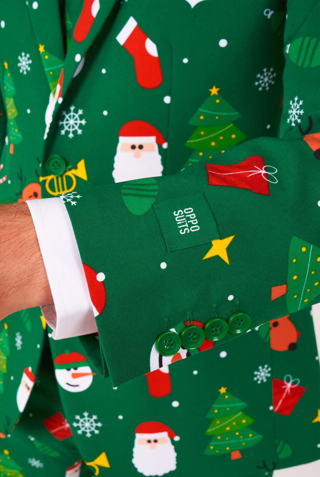 Christmas is the gift that keeps on giving, every year. If you are in need of a festive look for the holidays, than seek no further than the green Festivity Christmas suit. It has Santa, reindeer, Christmas trees and glittering stars It is the most festive look you've ever had and will put you firmly on Santa's 'good'-list as a yearly reward.