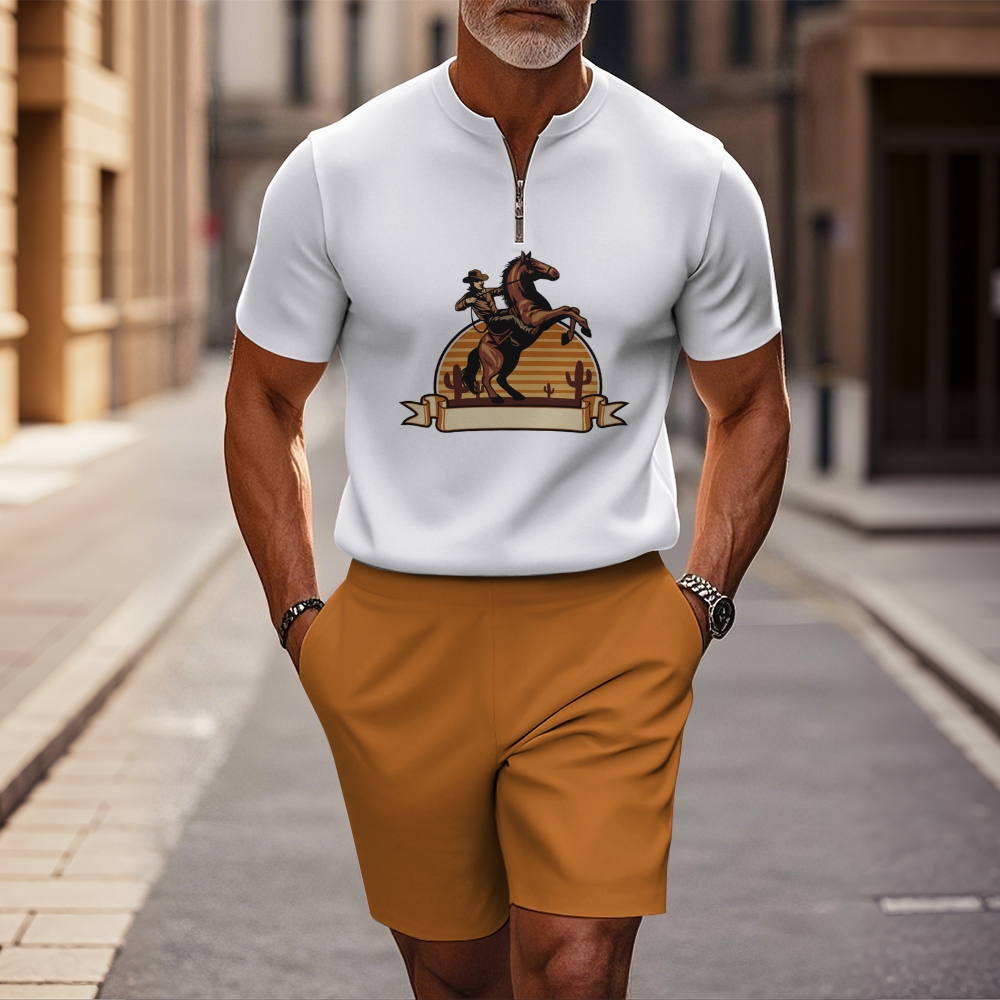 Men's fashion casual round-neck zipper geometric printed short-sleeved two-piece set 2504000276
