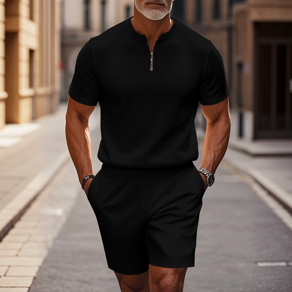 Men's fashion casual round-neck zipper geometric printed short-sleeved two-piece set 2505000453
