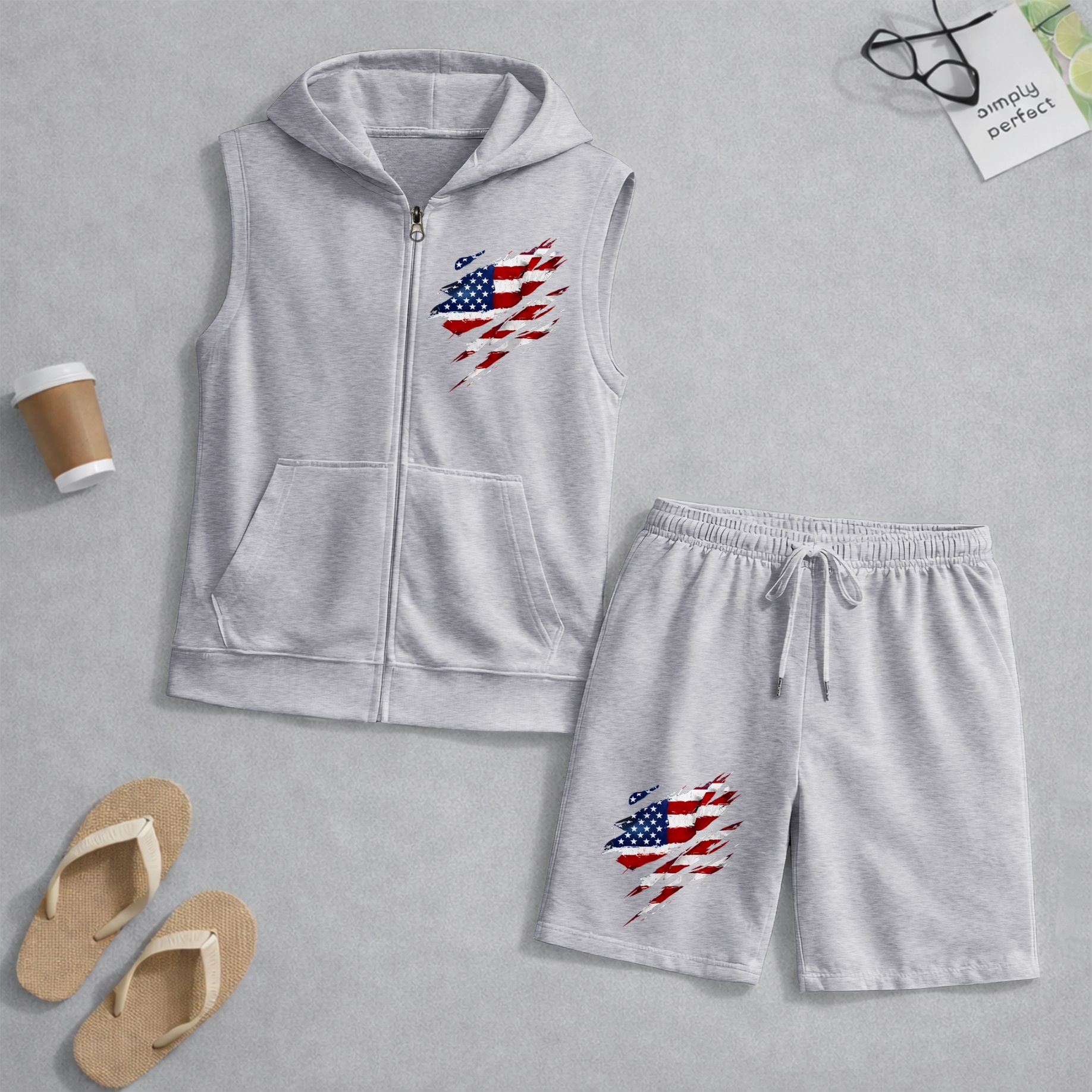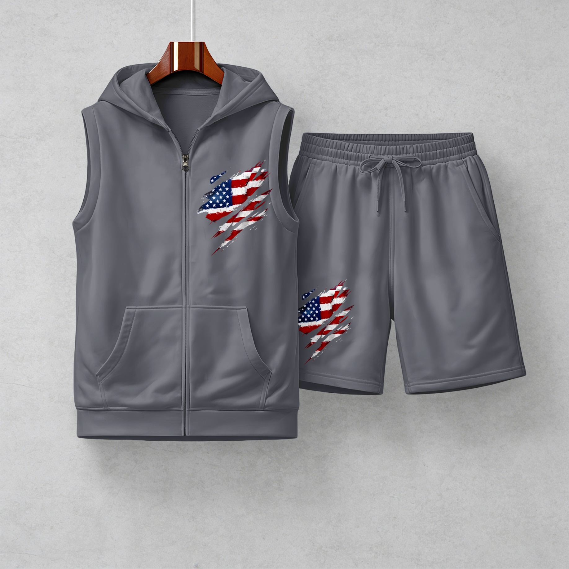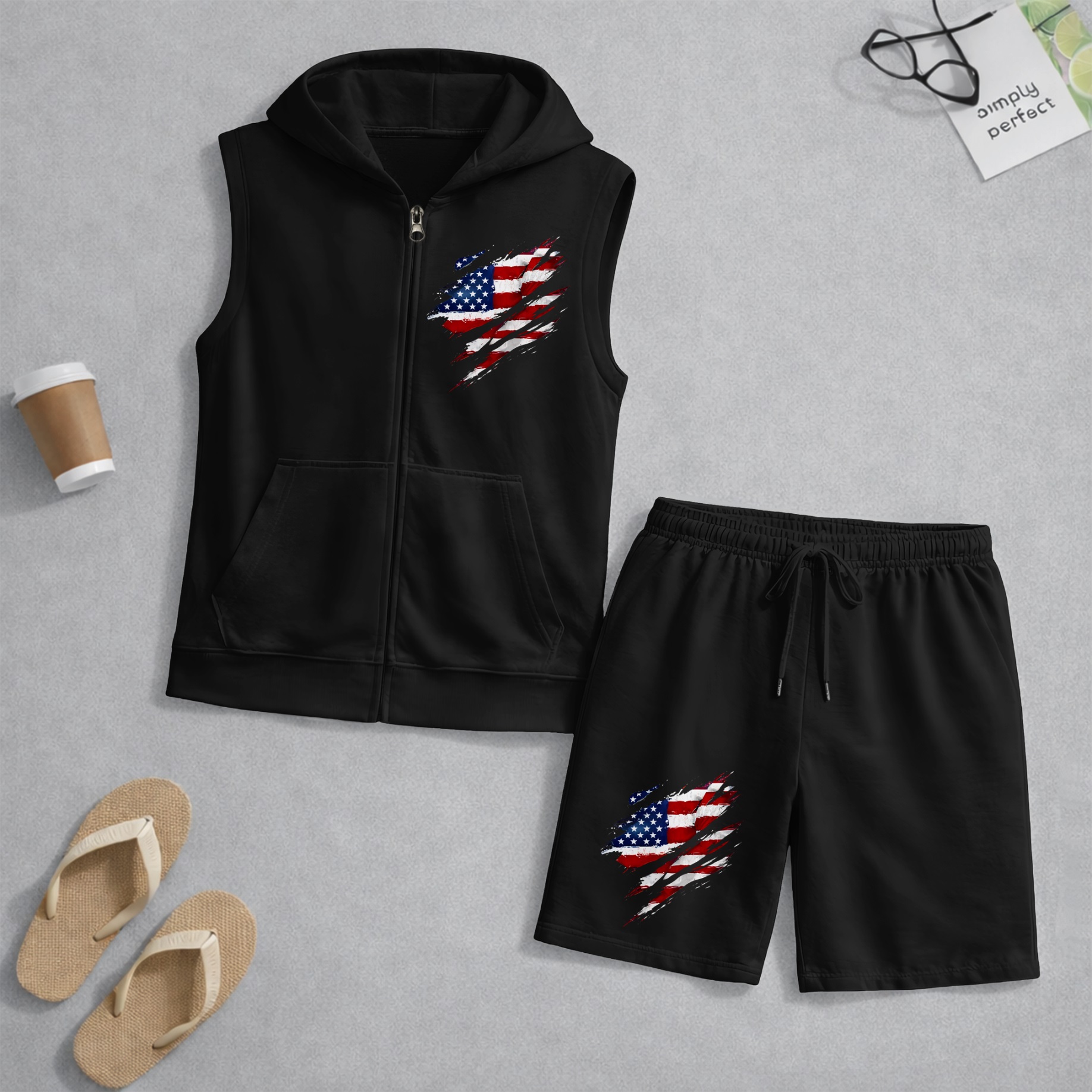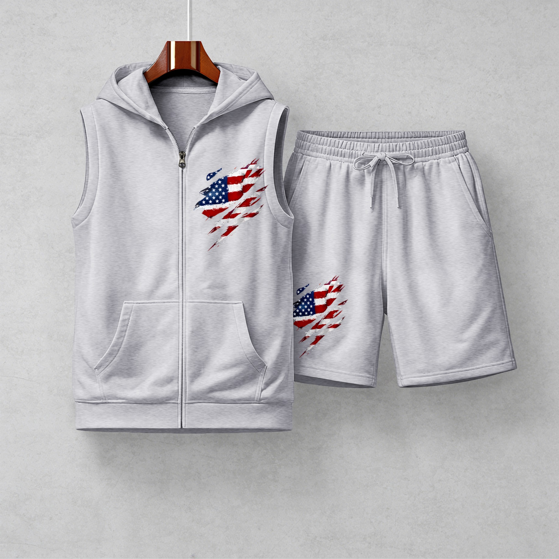 Men's American Flag Graphic Sleeveless Hoodie Shorts Set 2 Piece Outfit USA Flag Print Zip Up Hooded Vest Drawstring Shorts Summer Casual Gym Workout Streetwear Breathable Lightweight Athletic Lounge Set