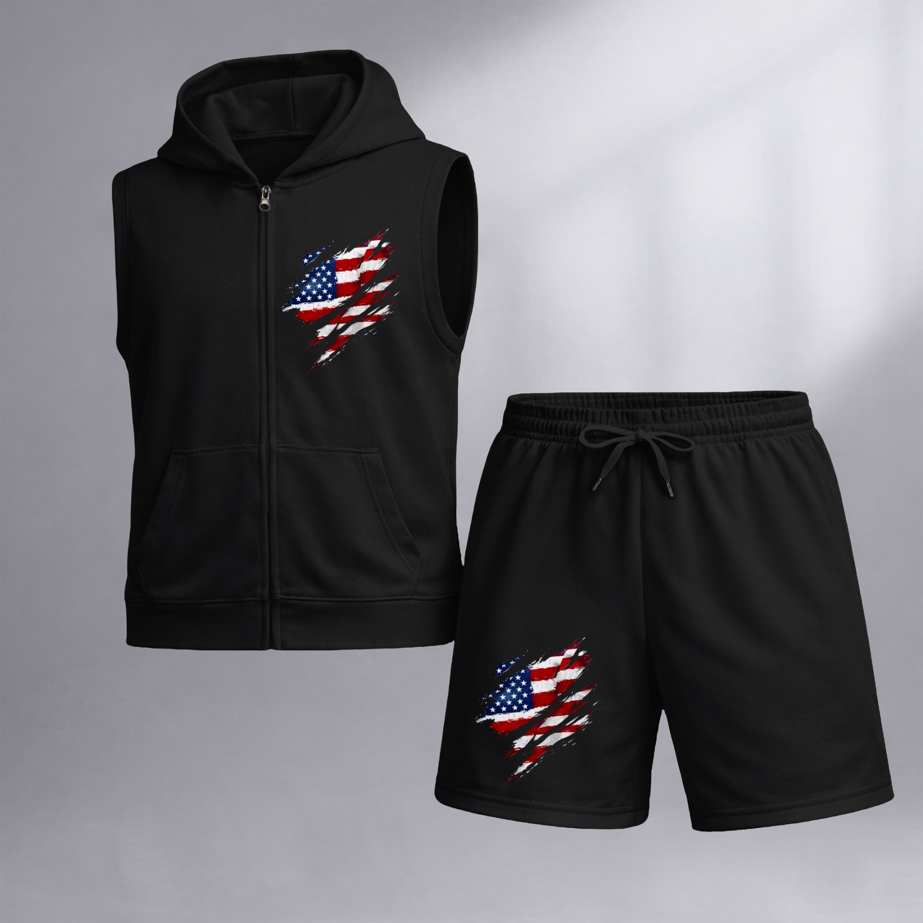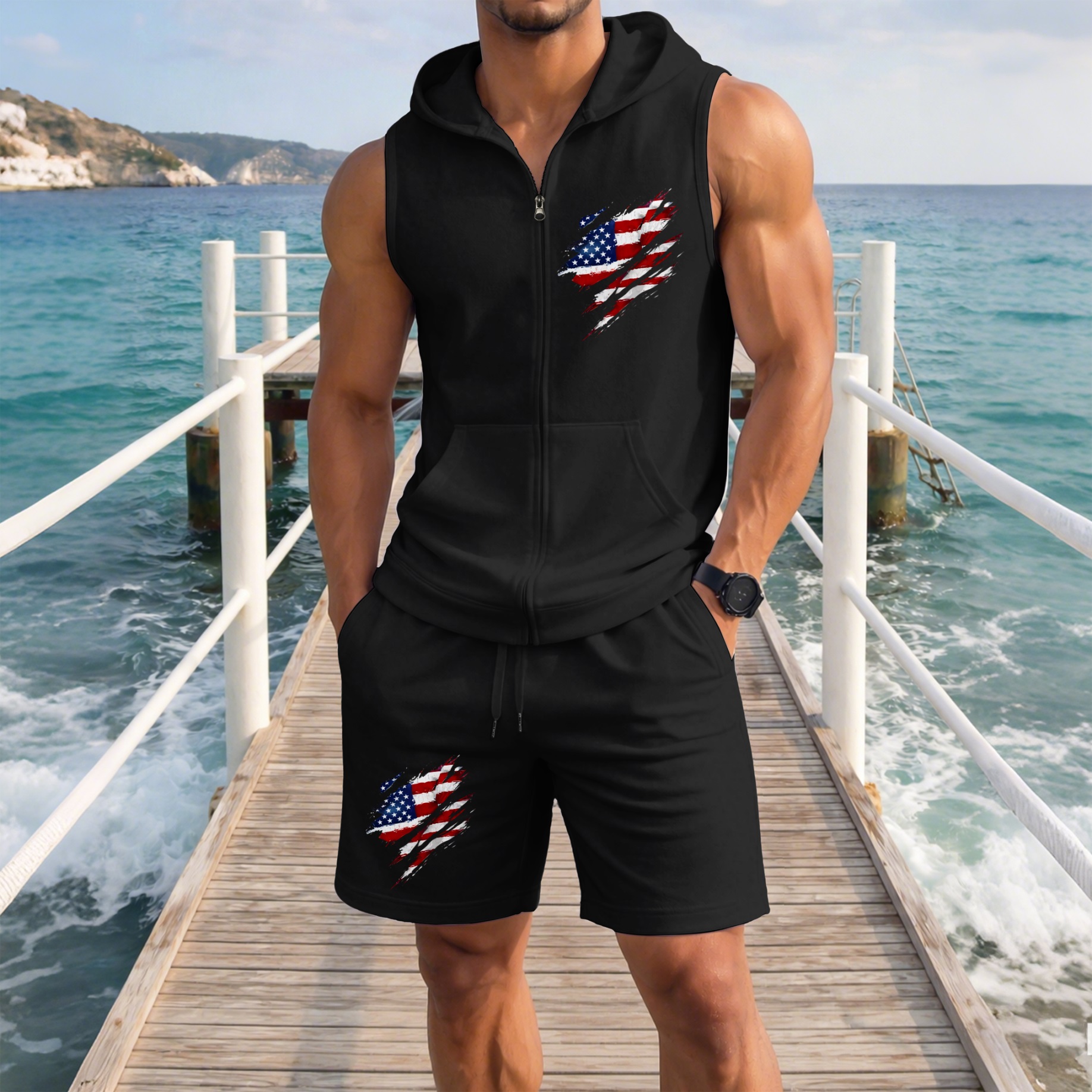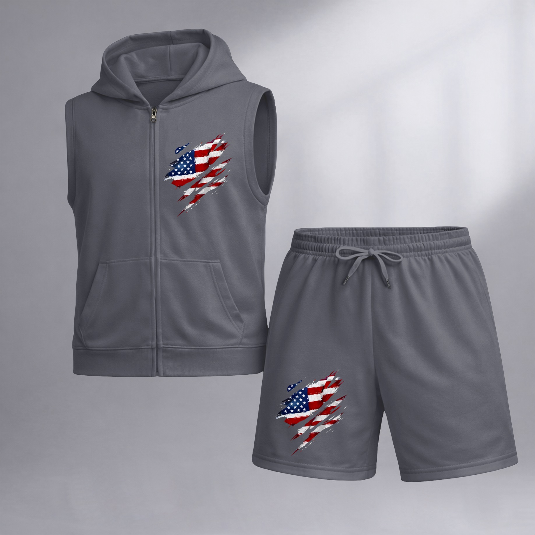Men's American Flag Graphic Sleeveless Hoodie Shorts Set 2 Piece Outfit USA Flag Print Zip Up Hooded Vest Drawstring Shorts Summer Casual Gym Workout Streetwear Breathable Lightweight Athletic Lounge Set