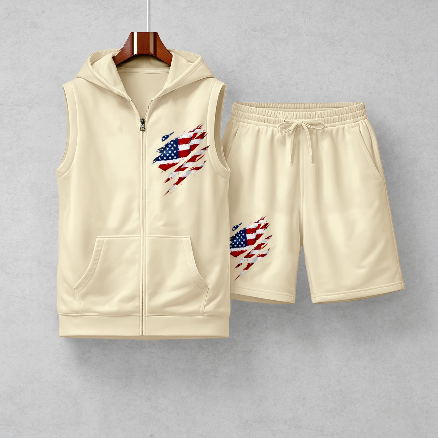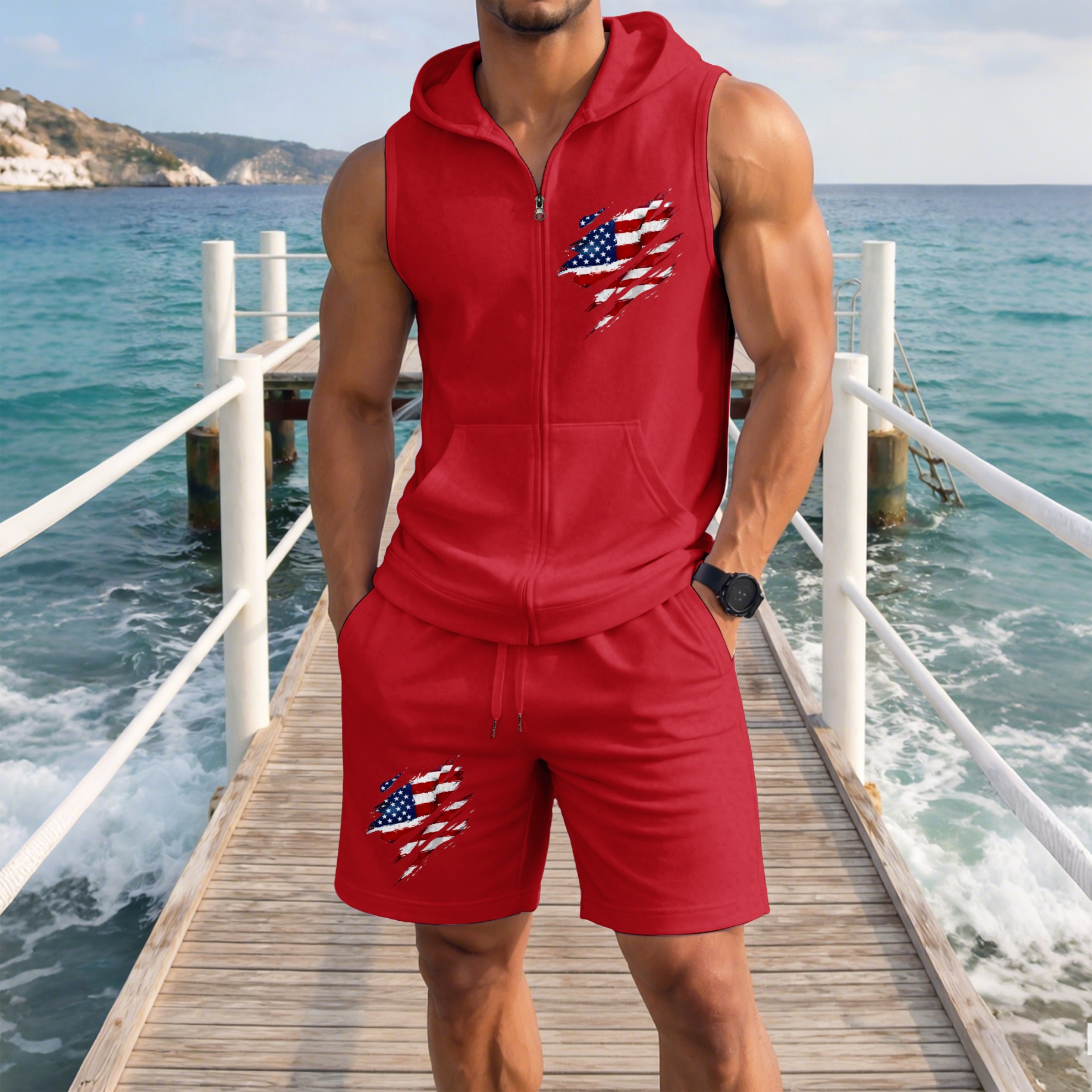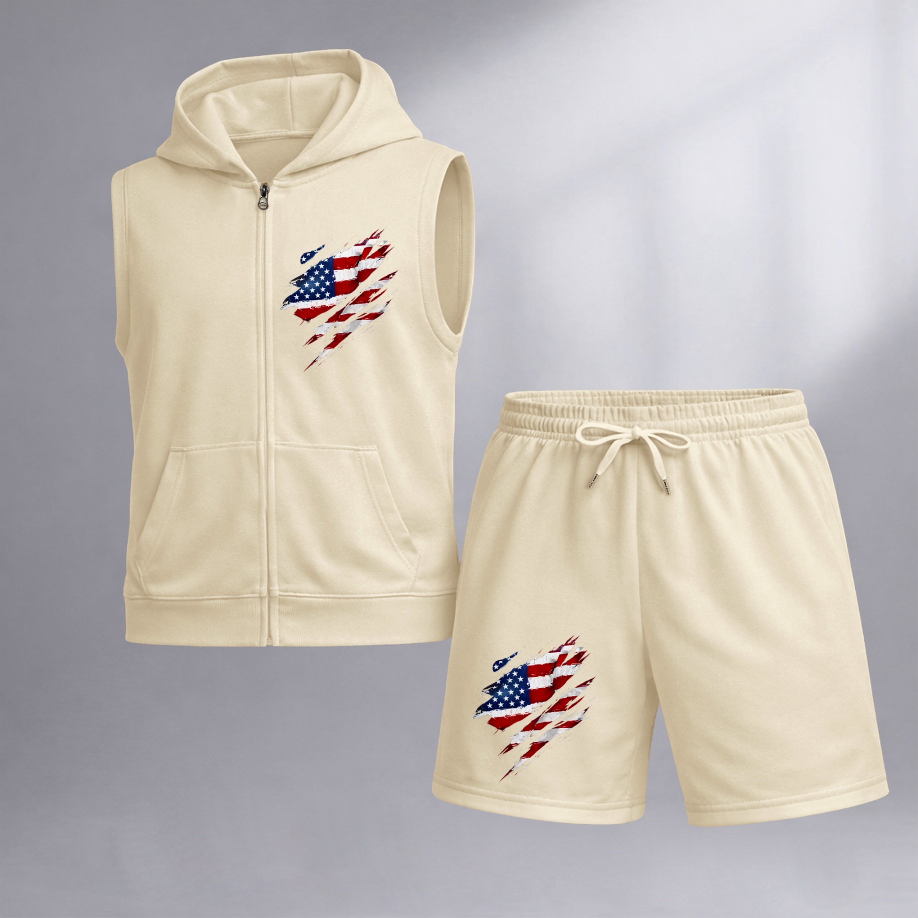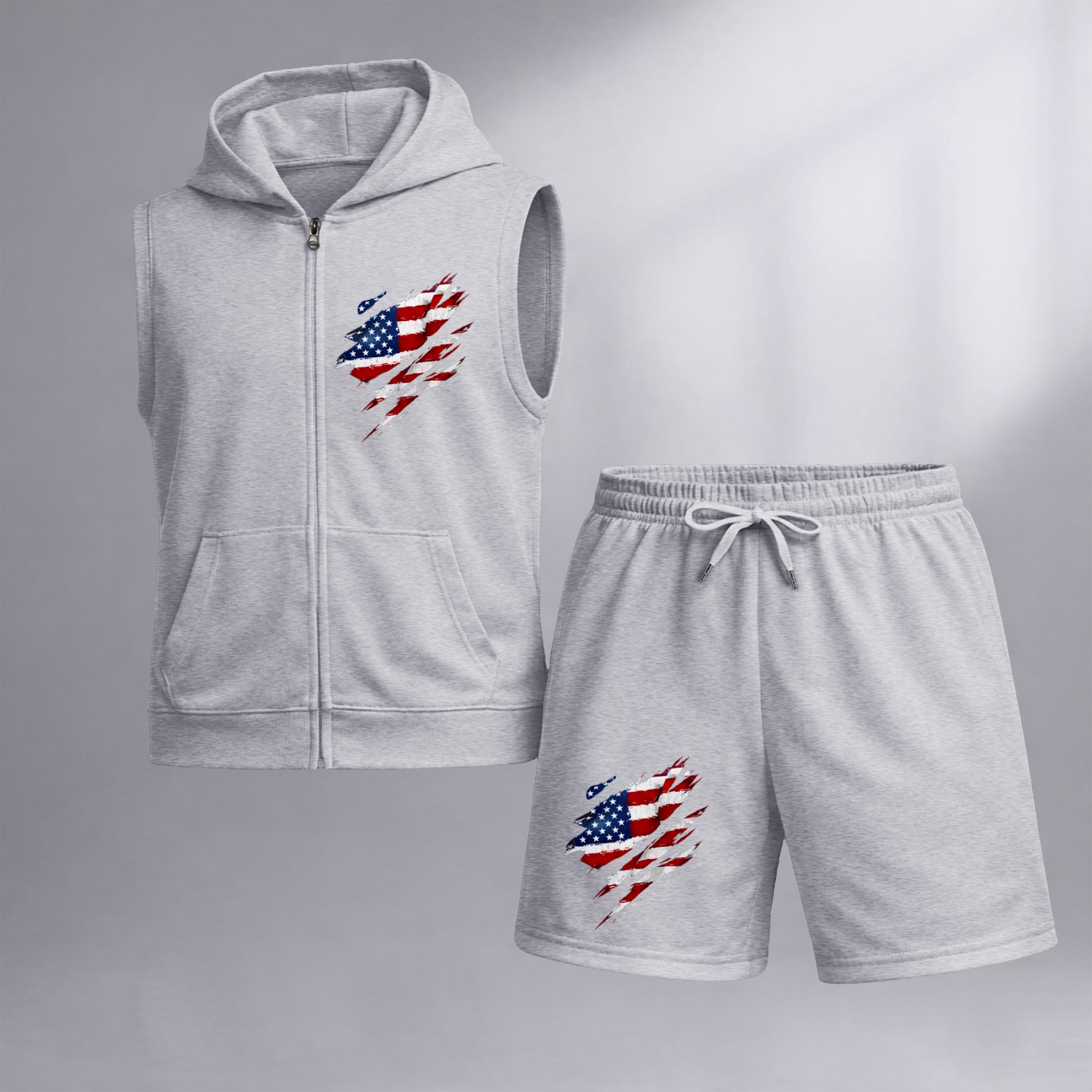 Men's American Flag Graphic Sleeveless Hoodie Shorts Set 2 Piece Outfit USA Flag Print Zip Up Hooded Vest Drawstring Shorts Summer Casual Gym Workout Streetwear Breathable Lightweight Athletic Lounge Set