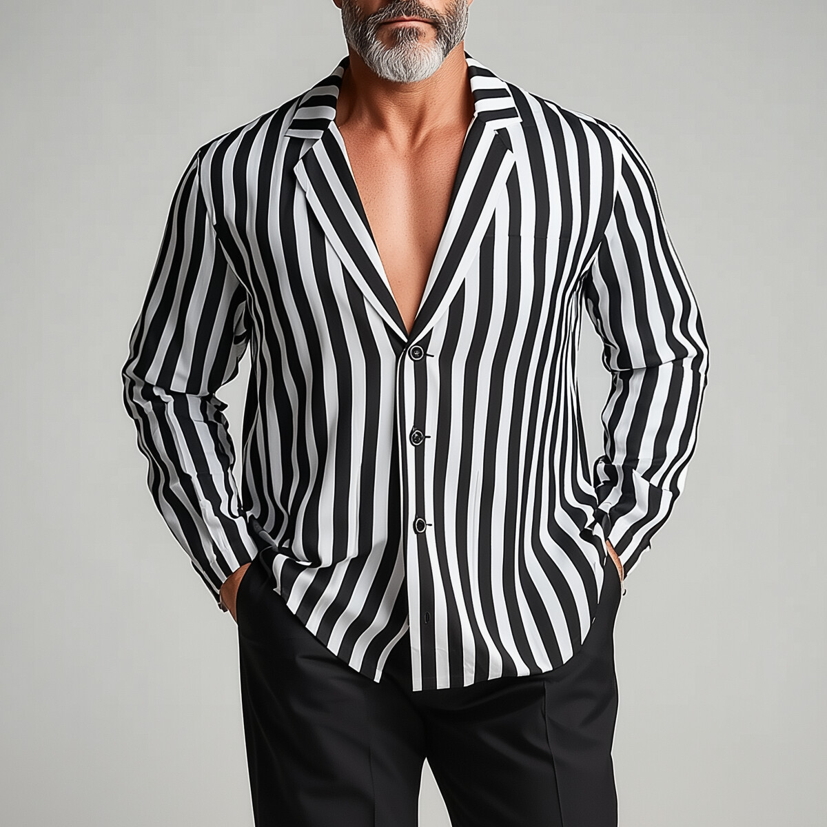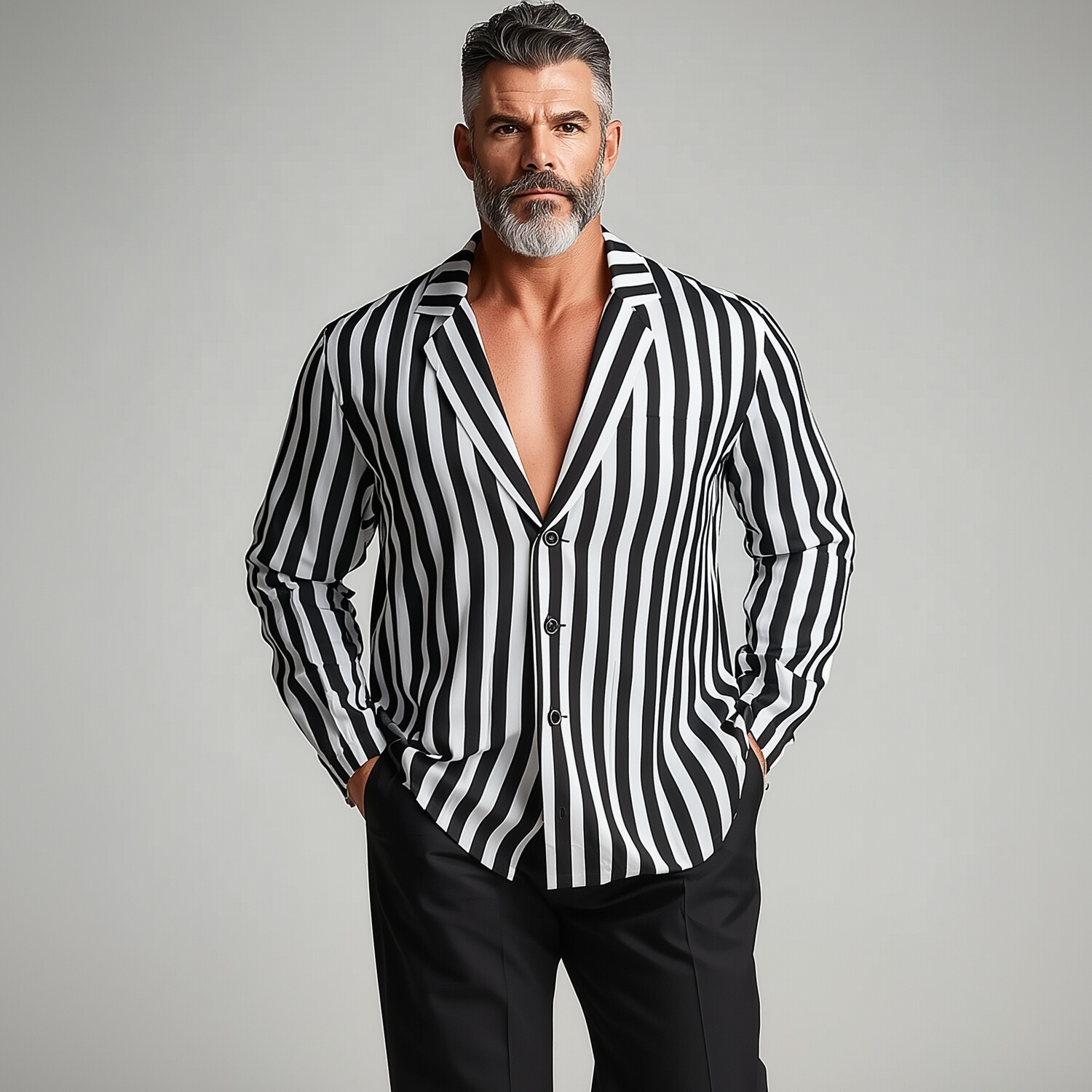Men's Black Striped Notch Lapel Three Button Long Sleeve Shirt