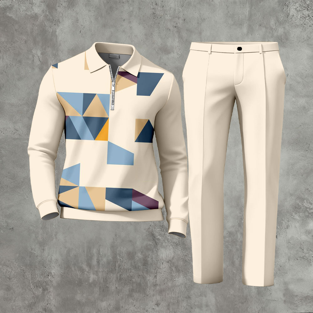 Men's Casual Apricot & Multi Color Matching Geometric Printed Zipper Long Sleeved Polo Shirt & Trousers Two-Piece Set