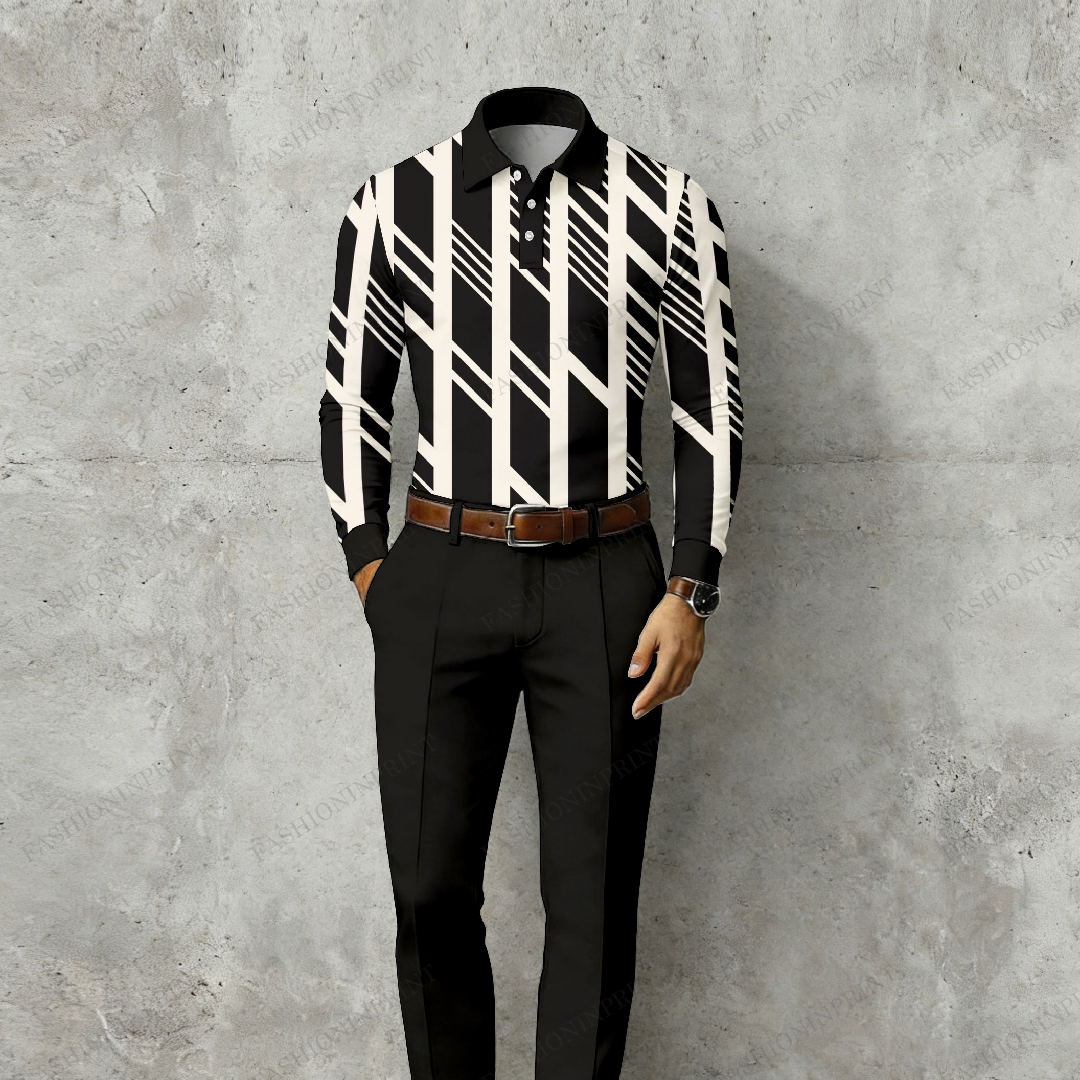 Men's Casual Black & Apricot Color Matching Geometric Printed Long Sleeved Polo Shirt & Trousers Two-Piece Set