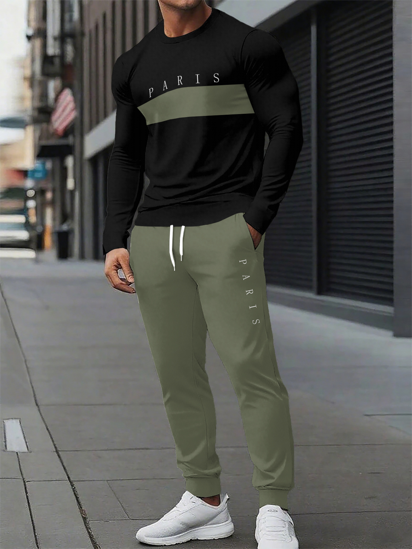 Men's Casual Black & Army Green Color Matching Geometric Printed Round Neck Long Sleeved Trousers Two-Piece Set