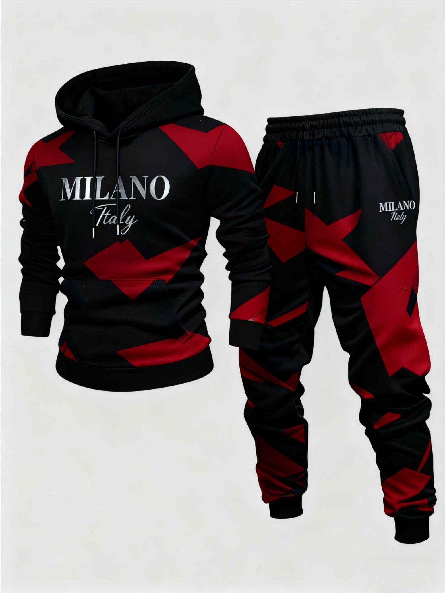 Men's Casual Black & Red Color Matching Geometric Printed Hoodies Long Sleeved Sweatshirts & Sweatpants Two-Piece Set