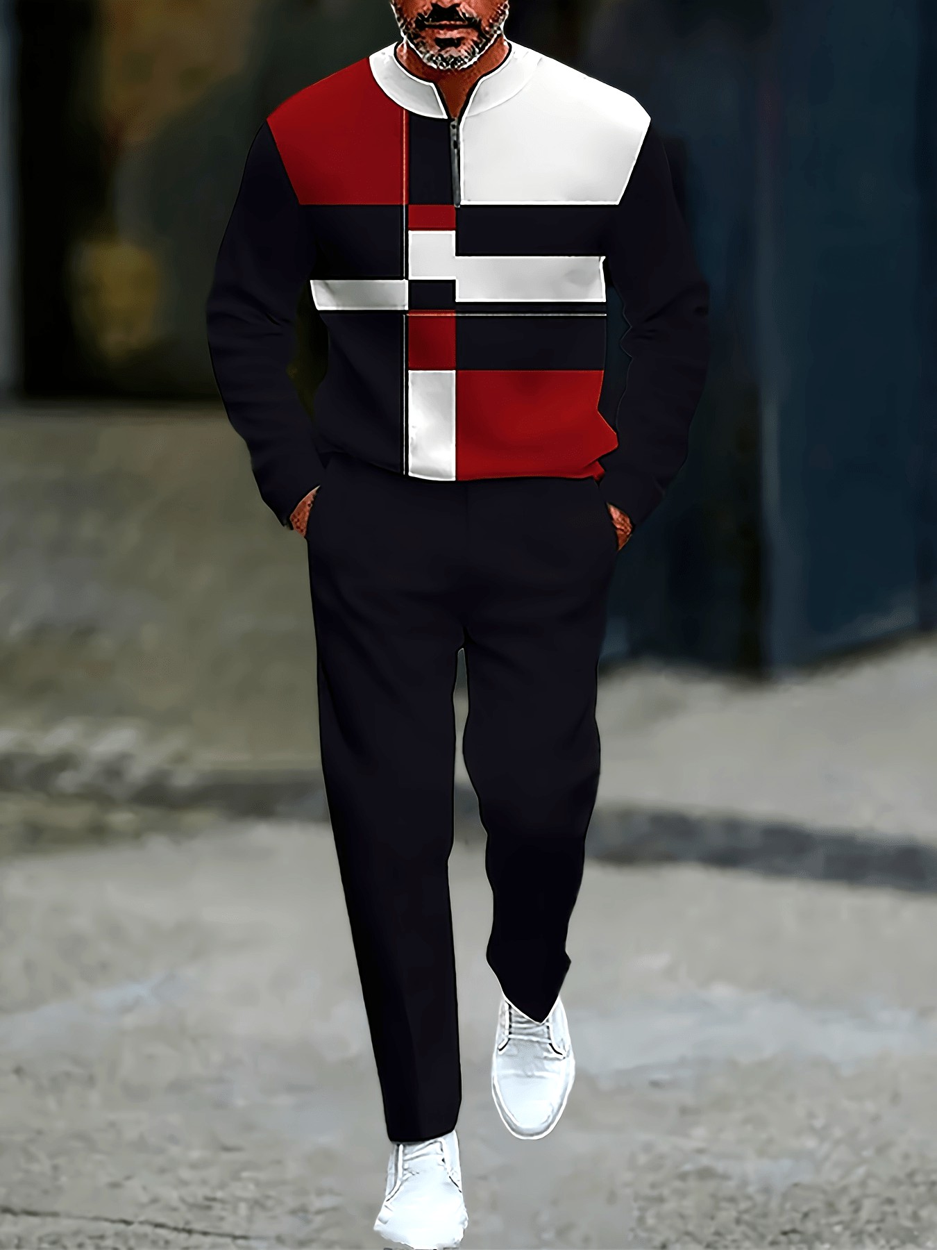 Men's Casual Black & Red Color Matching Geometric Printed Round-Neck Zipper Long Sleeved Trousers Two-Piece Set
