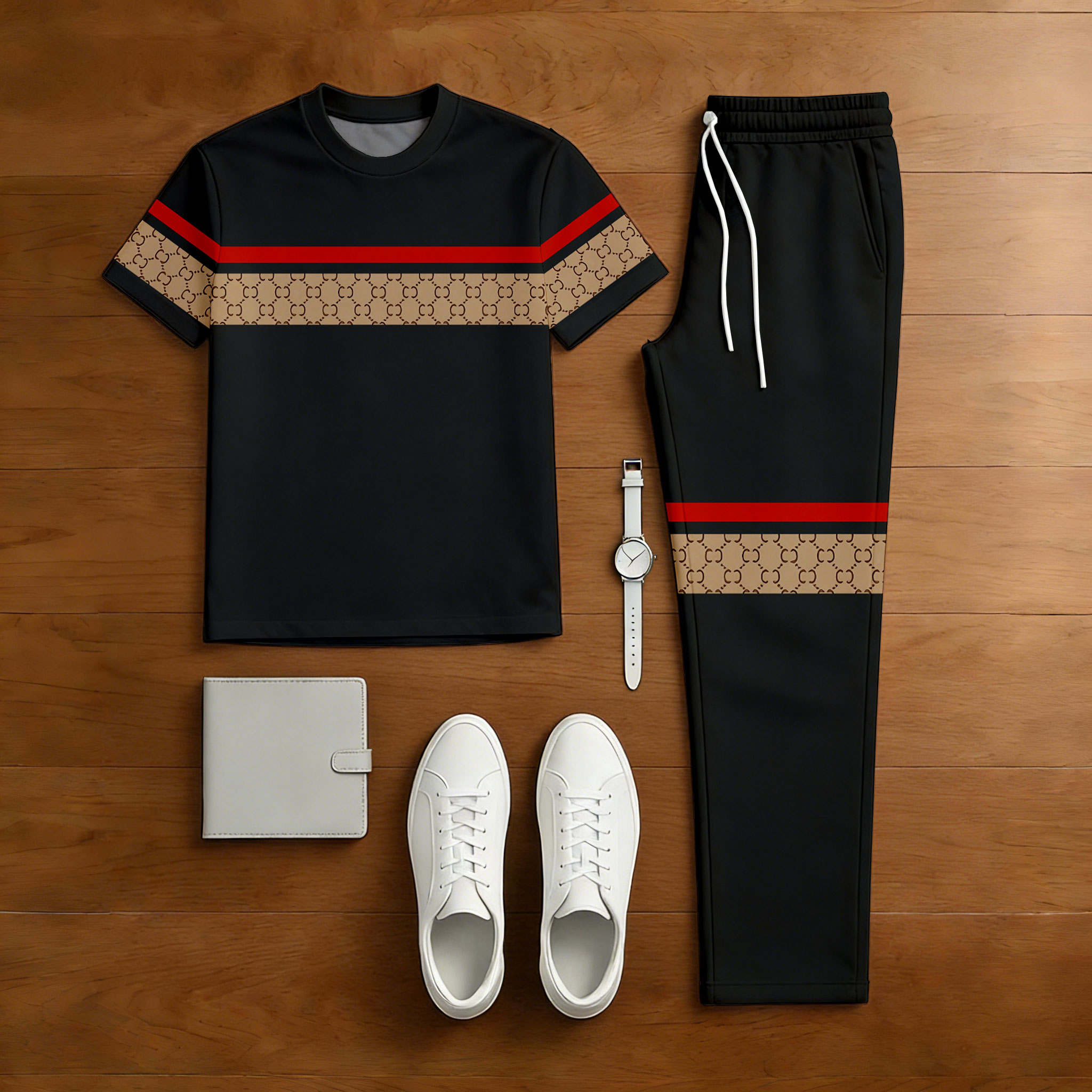 Men's Casual Black & Tan Color Matching Striped Printed Short Sleeved T-Shirt & Trousers Two-Piece Set