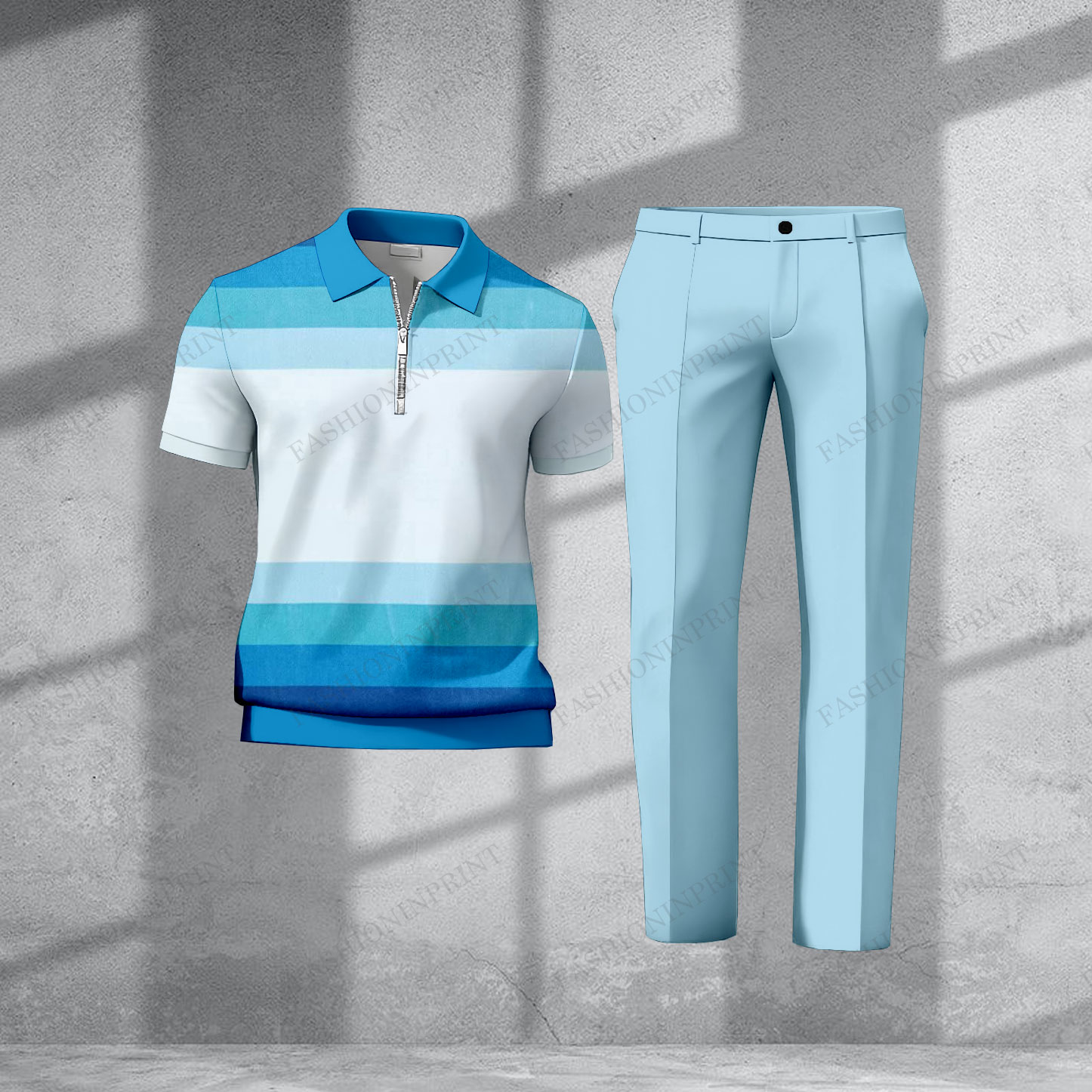 Men's Casual Blue & White Gradient Color Matching Printed Short Sleeved Zipper Polo Shirt & Trousers Two-Piece Set
