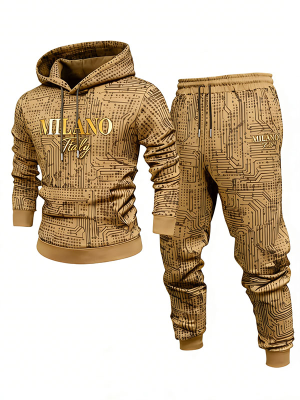 Men's Casual Brown & Gold Color Polka Dots Printed Hoodies Long Sleeved Sweatshirts & Sweatpants Two-Piece Set