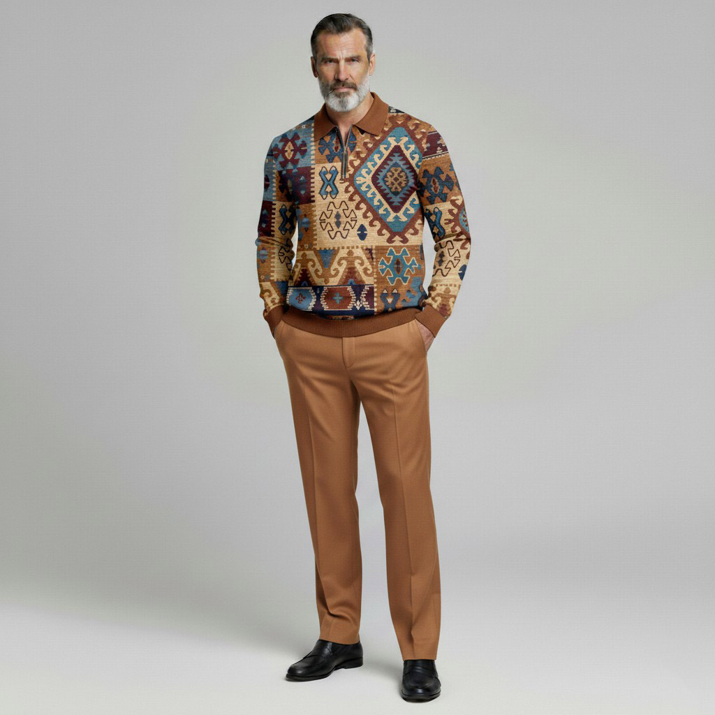 Men's Casual Brown & Multi Color Matching Retro Style Printed Polo-Collar Zipper Long Sleeved Trousers Two-Piece Set