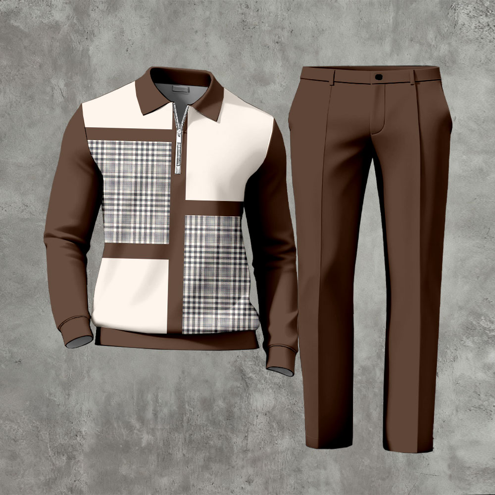 Men's Casual Coffee & Beige Color Matching Geometric Asymmetric Printed Zipper Long Sleeved Polo Shirt & Trousers Two-Piece Set