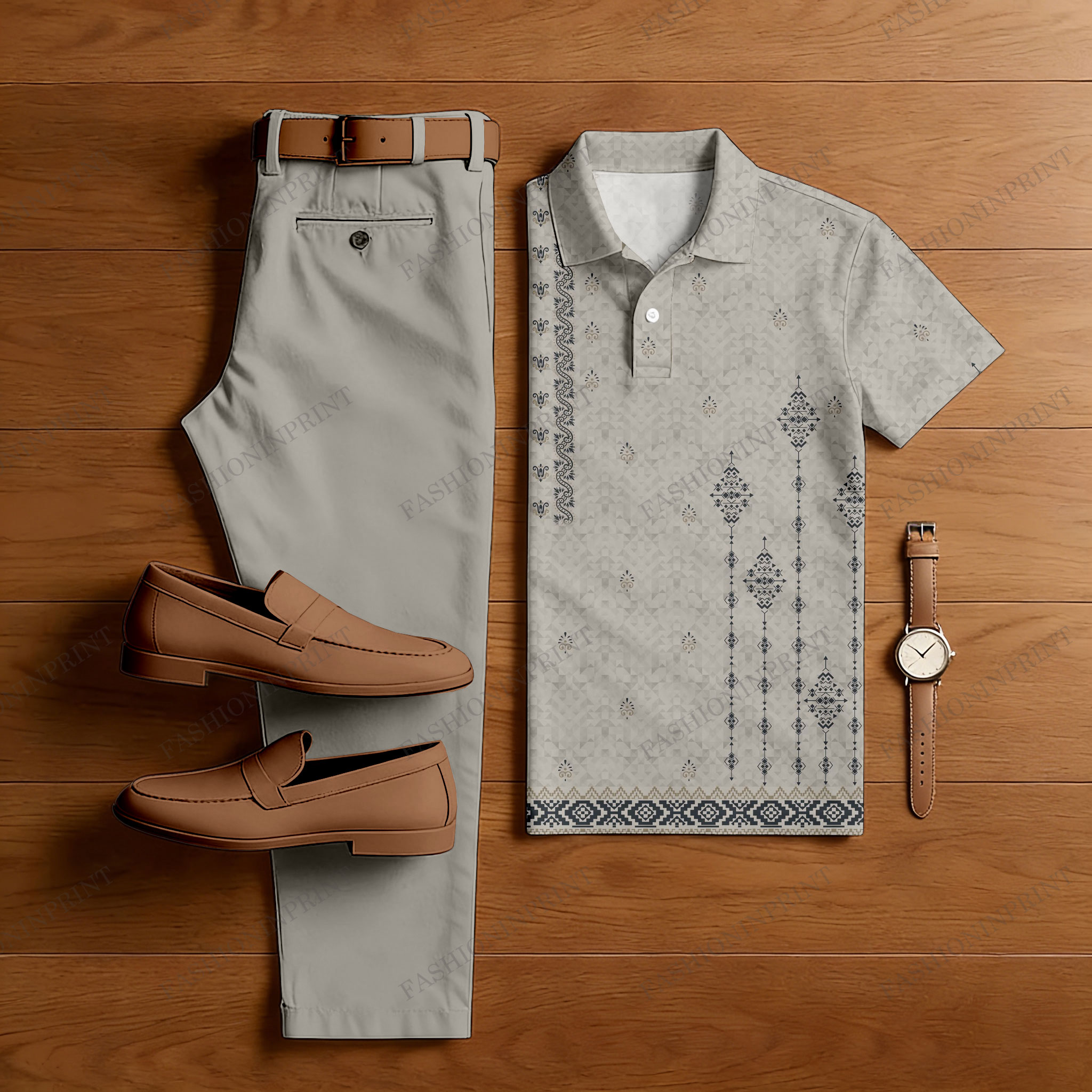 Men's Casual khaki Geometric Printed Short Sleeved Polo Shirt & Trousers Two-Piece Set