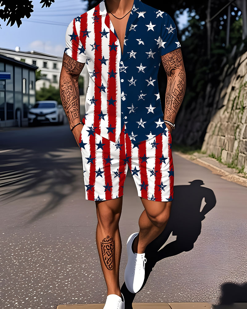 Men's Casual Navy Blue & Red National Flag Elements Printed Short Sleeved Shirt & Shorts Two Piece Set