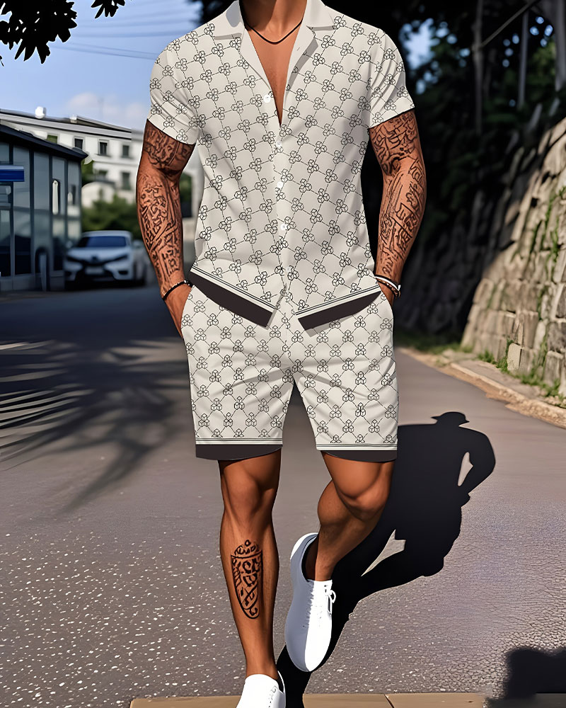 Men's Casual White & Dark Coffee Color Matching Vintage Style Printed Short Sleeved Shirt & Shorts Two Piece Set