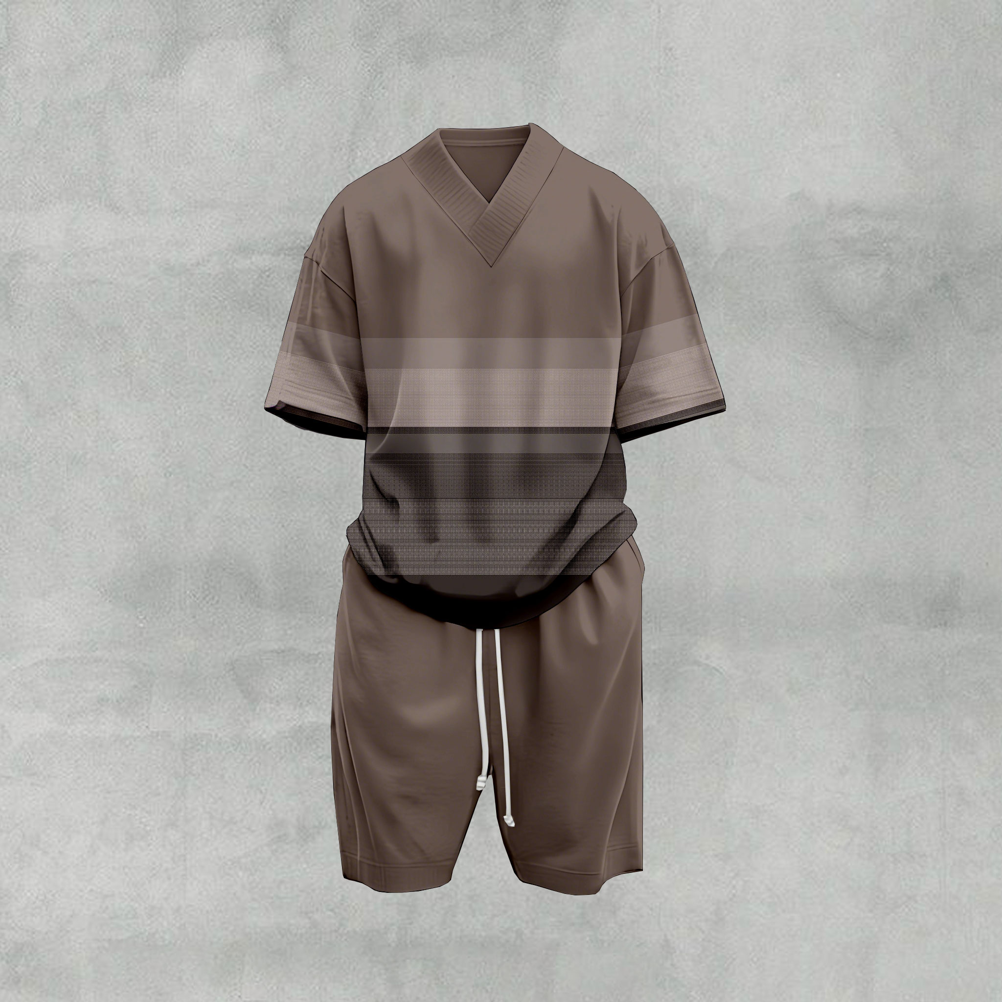 Men's Casual Coffee Color Matching Striped Printed V-Neck Short Sleeved T-Shirt & Six Point Shorts Two-Piece Set