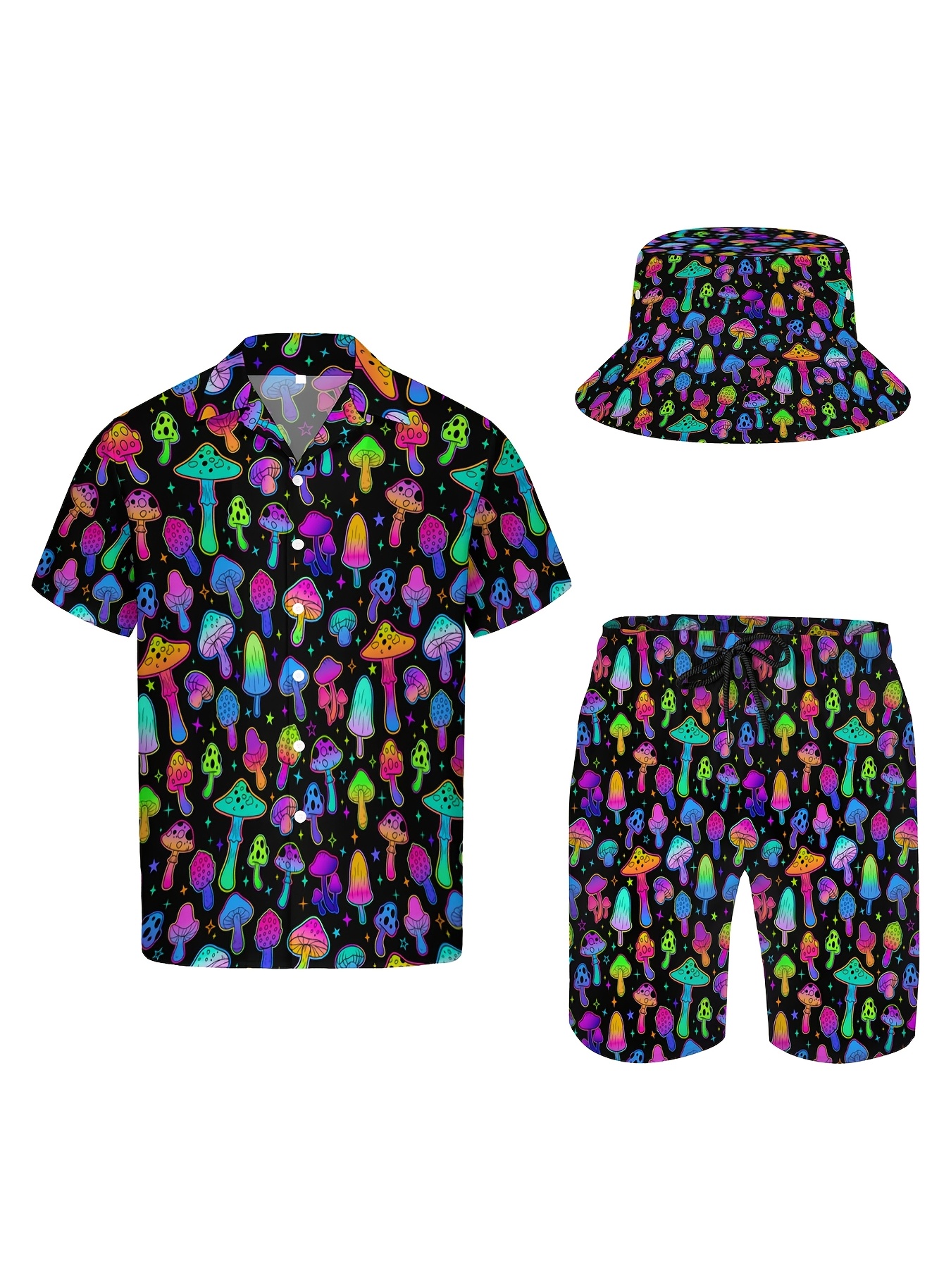 3pcs Men's Hawaiian Rainbow Mushroom Magic Pattern Printed Short Sleeves Shirt & Short & Fisherman's Hat