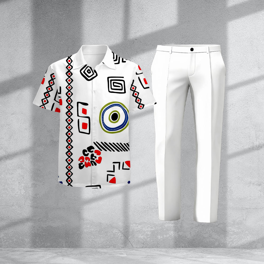 Men's Casual White & Multi Color Matching Simple Line Drawing Print Short-Sleeve Shirt & Trousers Two-Piece Set