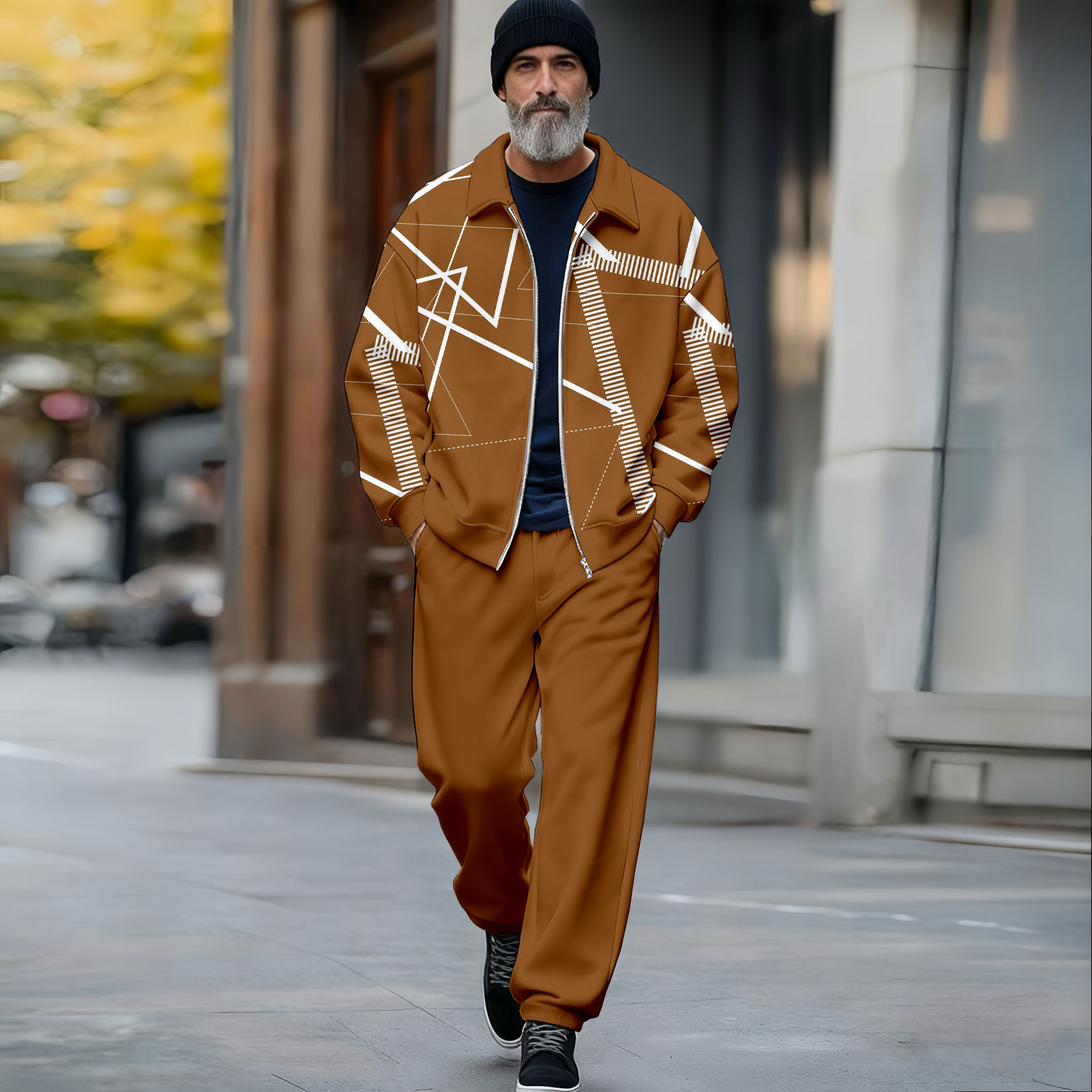 Men's Casual Color Matching Printed Lapel-Collar Long Sleeved Trousers Brown Two-Piece Set