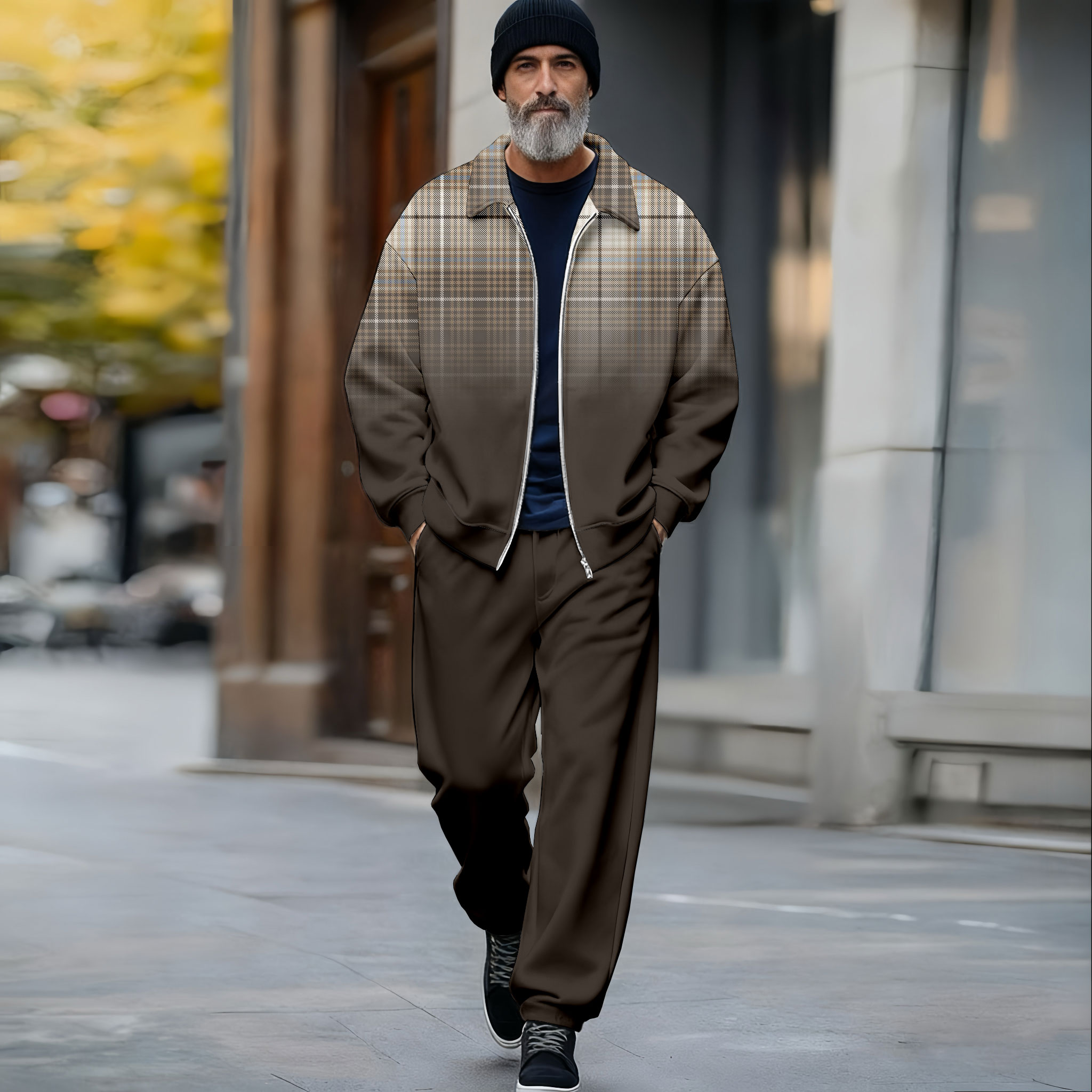 Men's Casual Coffee Checked Gradient Color Lapel-Collar Long Sleeved Trousers Two-Piece Set