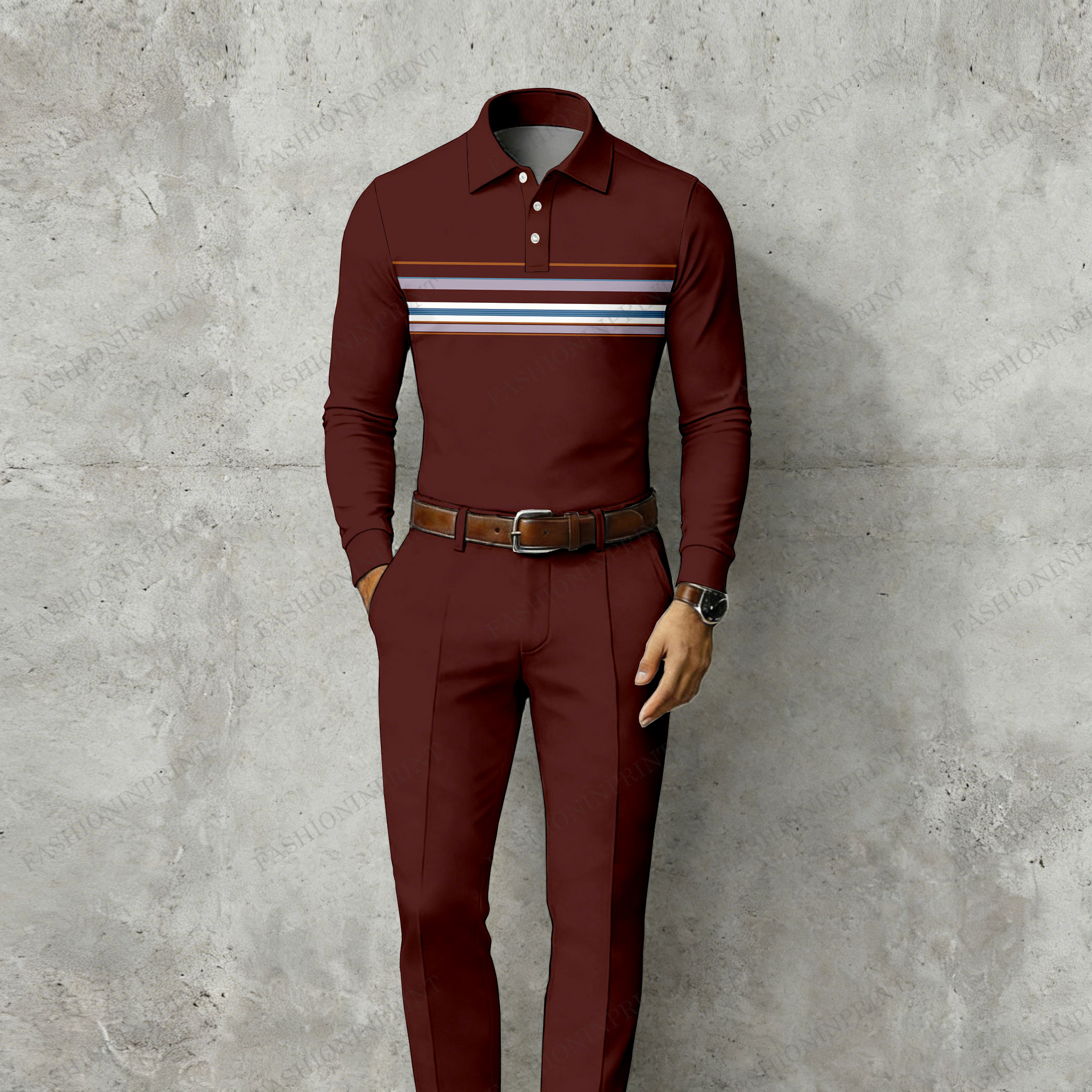 Men's Casual Maroon & Multi Color Matching Striped Printed Long Sleeved Polo Shirt & Trousers Two-Piece Set