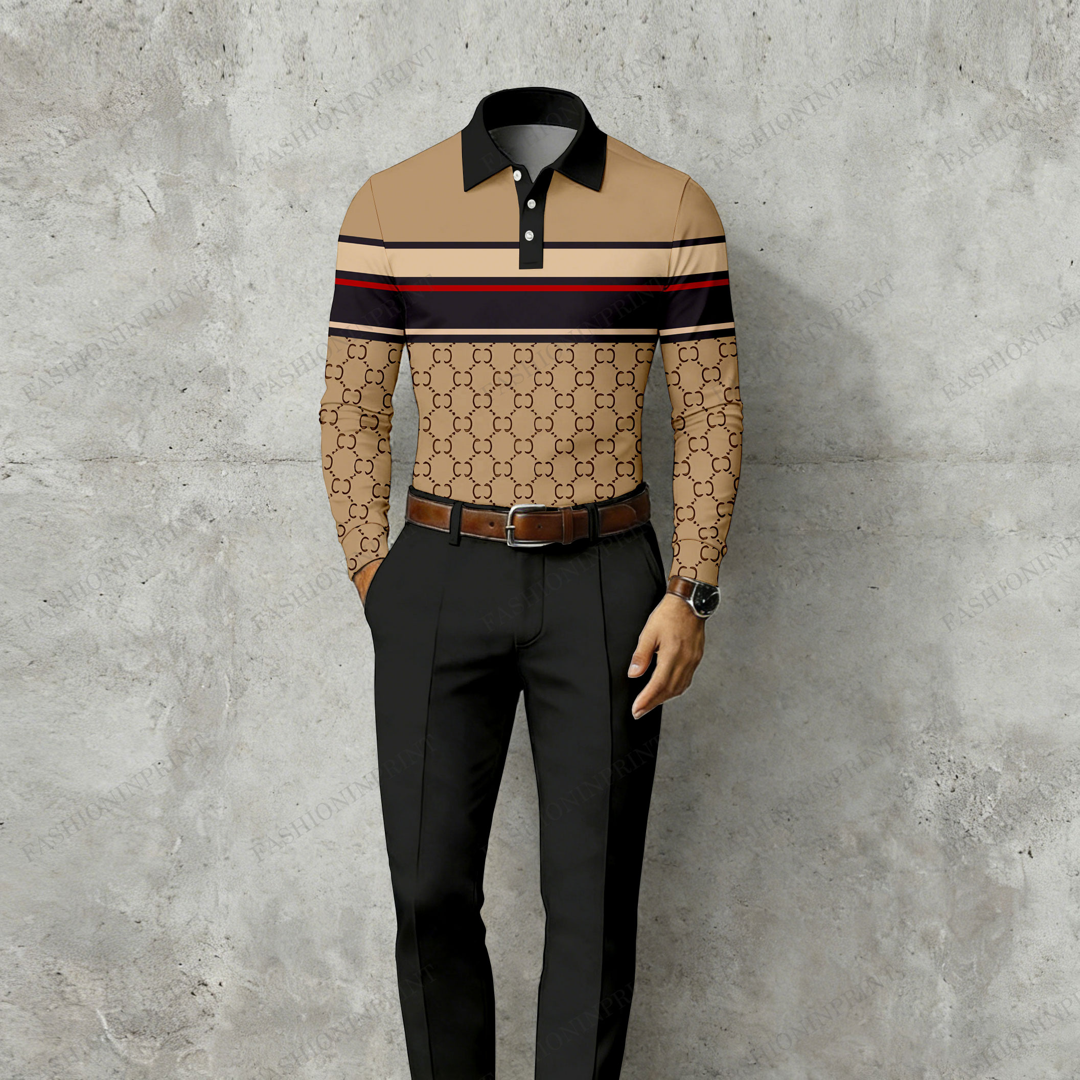 Men's Casual Tan & Black Color Matching Retro Style Printed Long Sleeved Polo Shirt & Trousers Two-Piece Set