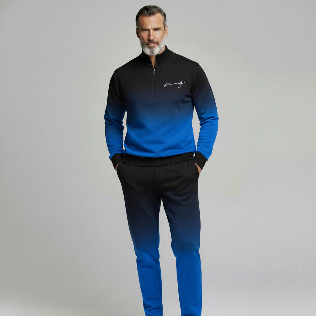 Men's Casual Royal Blue Gradient Color Matching Printed Polo-Collar Zipper Long Sleeved Trousers Two-Piece Set